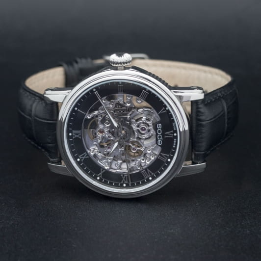 Мужские механические часы с автоподзаводом Epos — это сочетание швейцарского мастерства и современного дизайна. Корпус диаметром 41 мм выполнен из нержавеющей стали 316L. Циферблат чёрного цвета частично скелетонизирован, оформлен римскими цифрами и дополнен гильошированным узором. Циферблат защищён сапфировым стекломСапфировое стеклоПрочный и надёжный материал из кристалла сапфира синтетического происхождения, характеризующийся особой твёрдостью и устойчивостью к царапинам и повреждениям.. Стрелки и метки с люминесцентным покрытиемЛюминесцентное покрытиеПозволяет считывать показания времени в темноте. Производители наносят на стрелки, часовые индексы, безель или поверхность циферблата светонакопительный состав, дающий холодное свечение., обеспечивающим хорошую читаемость в темноте. Механизм — швейцарский калибр ETA 2892, декорированный вручную. Прозрачная задняя крышка позволяет наблюдать за работой механизма. Заводная головка — завинчивающаяся. Часы оснащены кожаным ремешком чёрного цвета с стандартной застёжкой. Водонепроницаемость 50 м позволяет использовать часы в повседневных условиях, защищая от случайных брызг и капель дождя. Гарантия — 24 месяца. Универсальный выбор для ценителя механики и элегантного стиля.