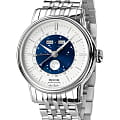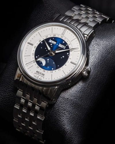 Мужские швейцарские механические часы с автоподзаводом Epos Oeuvre d'art 3439.322.20.18.30. Сапфировое стеклоСапфировое стеклоПрочный и надёжный материал из кристалла сапфира синтетического происхождения, характеризующийся особой твёрдостью и устойчивостью к царапинам и повреждениям. устойчивое к появлению царапин, обладающее высокой прозрачностью. Корпус и браслет часов изготовлен из нержавеющей стали. Стрелки и метки с люминесцентной подсветкойЛюминесцентное покрытиеПозволяет считывать показания времени в темноте. Производители наносят на стрелки, часовые индексы, безель или поверхность циферблата светонакопительный состав, дающий холодное свечение.. В механизме 25 камней, частота 28800 полуколебаний в час. Запас хода 42 часа. Механизм декорирован узором Cotes de Geneve. Циферблат выполнен по технологии Sunray (солнечные лучи). В центре циферблат дополнен изображением ночного неба со светящимися звездами и большой светящейся луной. Накладные метки в виде штрихов. Дата отображается центральной стрелкой. Окошко дня недели и месяца. Автоматический указатель фазы луны. Винтажная заводная головка. Прозрачная задняя крышка. Класс водозащиты: 50 метров, позволит защитить корпус от случайных брызг или капель дождя. Стальной браслет на раскладной застёжкеРаскладная застёжкаТакой тип застёжки используется только на браслетах из металла. Она никогда не раскрывается полностью, происходит разделение на 2 и более частей. Раскладывающая застёжка снизит вероятность потери часов к минимуму..