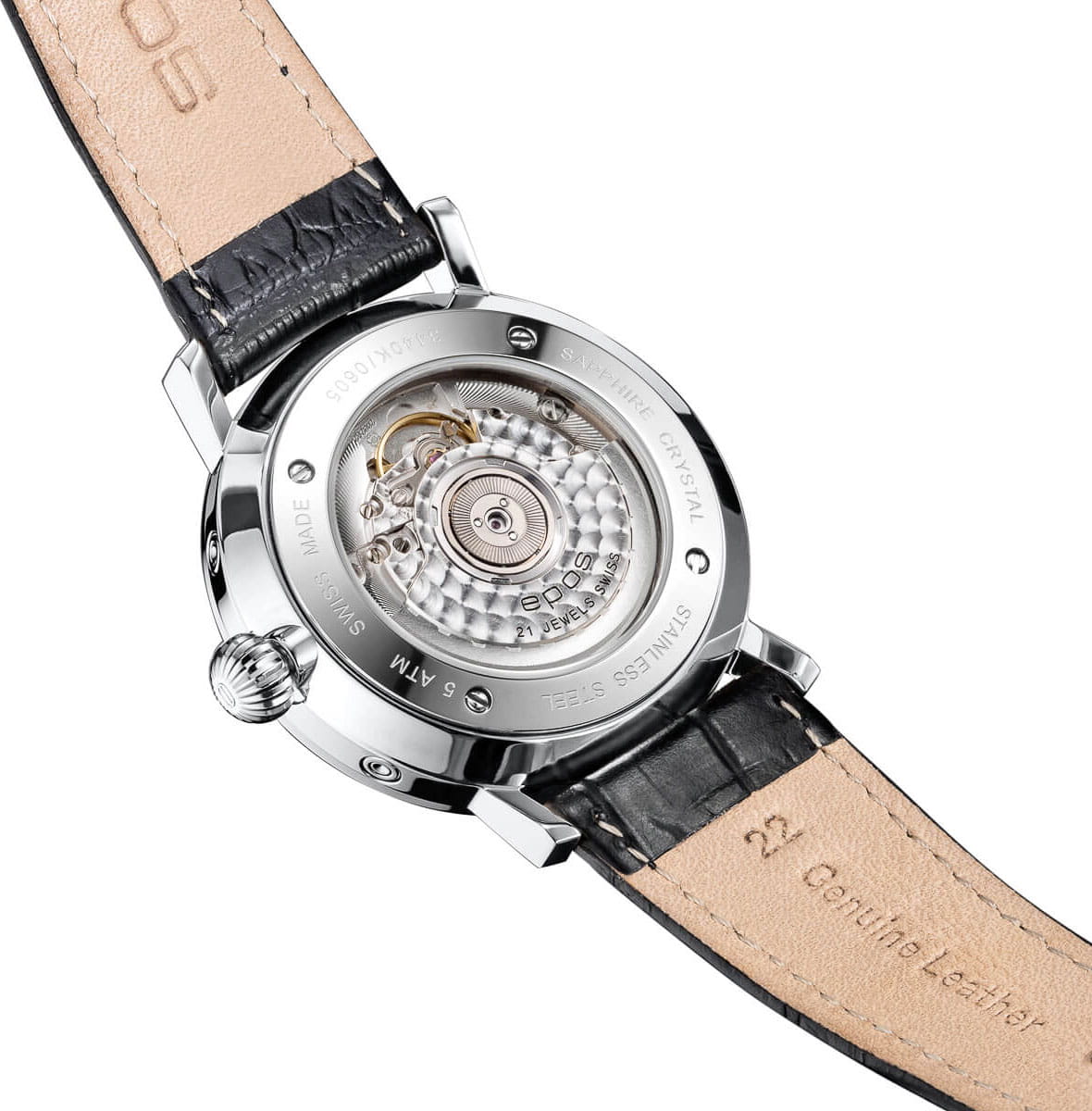 Мужские швейцарские механические часы с автоподзаводом Epos Big Moon 3440.322.20.14.25. Сапфировое стеклоСапфировое стеклоПрочный и надёжный материал из кристалла сапфира синтетического происхождения, характеризующийся особой твёрдостью и устойчивостью к царапинам и повреждениям. устойчивое к появлению царапин, обладающее высокой прозрачностью. Корпус часов изготовлен из нержавеющей стали. Стрелки и метки с люминесцентной подсветкойЛюминесцентное покрытиеПозволяет считывать показания времени в темноте. Производители наносят на стрелки, часовые индексы, безель или поверхность циферблата светонакопительный состав, дающий холодное свечение.. Циферблат с метками в виде точек. Дата отображается центральной стрелкой. Окошки для дня недели и месяца, индикатор фазы Луны. Часовой механизм декорирован жемчужной фактурной шлифовкой (Le Perlage). Прозрачная задняя крышка. Класс водозащиты: 50 метров, позволит защитить корпус от случайных брызг или капель дождя. Кожаный ремешок на стандартной застёжке.