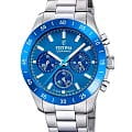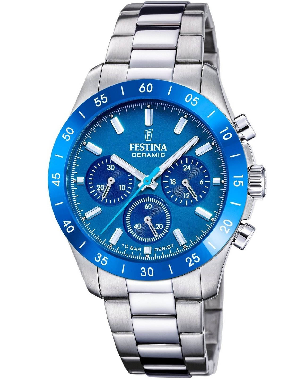 Часы Festina Ceramic Chrono F20693/4 — элегантная женская модель, сочетающая стиль и функциональность. Корпус диаметром 39 мм выполнен из нержавеющей стали с керамическим безелемБезельВнешний ободок, закрепляющий стекло. В спортивных часах так называется поворотное кольцо с делениями на циферблате, выполняет роль таймера – замеряет отрезки времени на шкале. Неподвижный безель – элемент декора. Однонаправленно вращающийся безель на дайверских часах позволяет фиксировать моменты погружения и выныривания на поверхность. синего цвета. Синий циферблат с хронографическими субциферблатами и индикатором даты защищён минеральным стекломМинеральное стеклоМинеральное стекло представляет собой искусственно выращенный минерал кварца. Такое стекло отличается особой устойчивостью к повреждениям и царапинам. Уступает по некоторым качествам сапфировому стеклу..