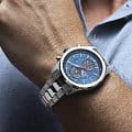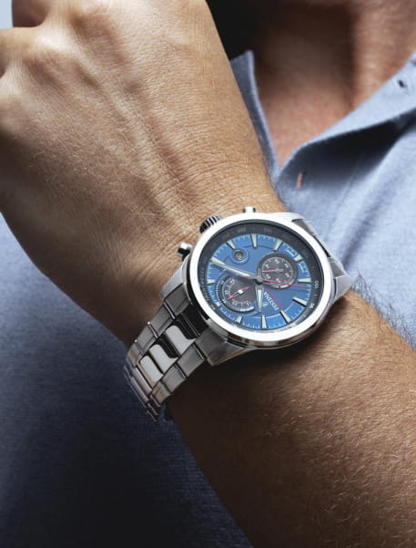 Кварцевый механизм с высокой точностью c хронографомХронографФункция позволяет измерять отрезки времени с особой точностью: часы, минуты, секунды. Верным признаком хронографа является наличие на циферблате 3 дополнительных окошек-счётчиков.. Минеральное стеклоМинеральное стеклоМинеральное стекло представляет собой искусственно выращенный минерал кварца. Такое стекло отличается особой устойчивостью к повреждениям и царапинам. Уступает по некоторым качествам сапфировому стеклу. устойчивое к появлению царапин, обладающее высокой прозрачностью. Класс водозащиты: 100 метров, позволит плавать, нырять и заниматься другими водными видами спорта. Корпус часов изготовлен из нержавеющей стали. Браслет из стали с раскладной застёжкойРаскладная застёжкаТакой тип застёжки используется только на браслетах из металла. Она никогда не раскрывается полностью, происходит разделение на 2 и более частей. Раскладывающая застёжка снизит вероятность потери часов к минимуму.. Стрелки и метки с люминесцентным покрытиемЛюминесцентное покрытиеПозволяет считывать показания времени в темноте. Производители наносят на стрелки, часовые индексы, безель или поверхность циферблата светонакопительный состав, дающий холодное свечение..
