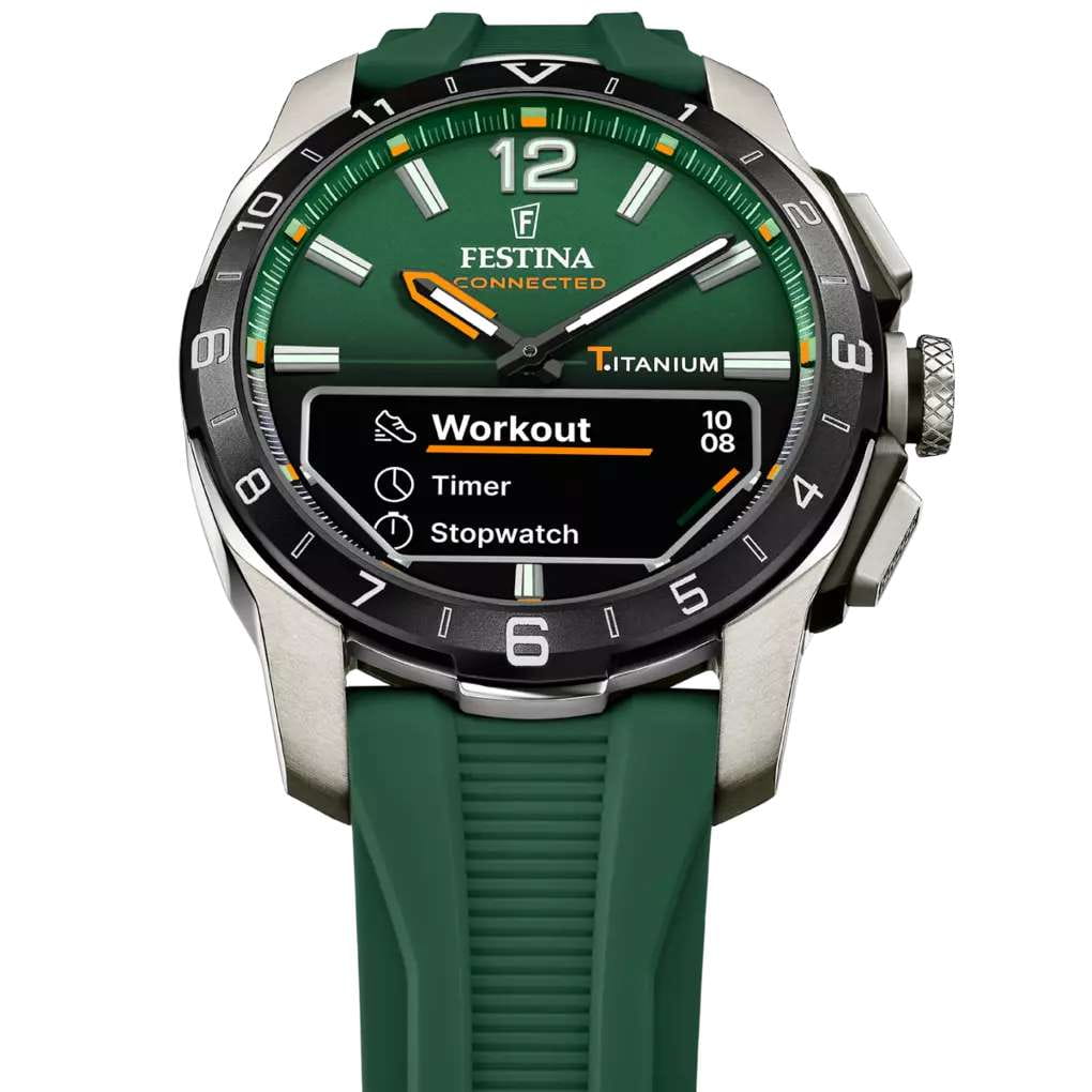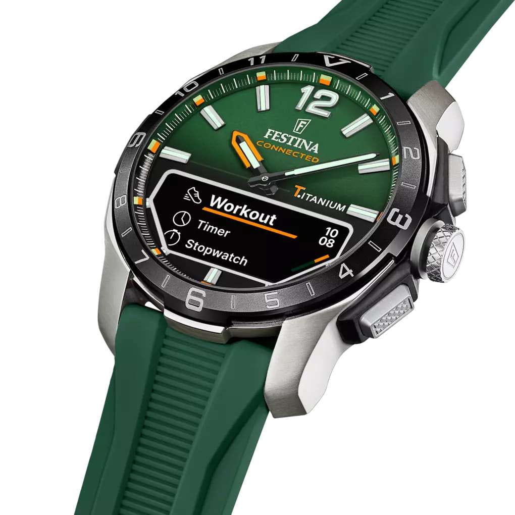 Мужские гибридные умные часы Festina Connected D — это современный аксессуар, сочетающий классический аналоговый дизайн и передовые технологии. Корпус диаметром 44 мм выполнен из лёгкого титана. БезельБезельВнешний ободок, закрепляющий стекло. В спортивных часах так называется поворотное кольцо с делениями на циферблате, выполняет роль таймера – замеряет отрезки времени на шкале. Неподвижный безель – элемент декора. Однонаправленно вращающийся безель на дайверских часах позволяет фиксировать моменты погружения и выныривания на поверхность. с IP-покрытиемIP-покрытиеМетод ионного напыления. Демонстрирует повышенную устойчивость к истиранию, окислению и химическим веществам. Под воздействием высокого давления и температуры около 1500°C молекулы металла надёжно соединяются с частицами корпуса часов.. Циферблат зелёного цвета оформлен штрихами и стрелками. В центре циферблата расположен небольшой OLED-дисплей для отображения цифровой информации. Циферблат защищён сапфировым стекломСапфировое стеклоПрочный и надёжный материал из кристалла сапфира синтетического происхождения, характеризующийся особой твёрдостью и устойчивостью к царапинам и повреждениям.. Часы оснащены функциями BluetoothBluetoothСовременная технология, позволяющая синхронизировать часы с телефоном и переносить данные. Часы с Bluetooth расширяют возможности вашего смартфона и делают его использование ещё более удобным., мирового времениМировое время Полезное часовое усложнение, отображающее время в основных городах и известных областях по всему миру, оно связано с часовыми поясами, удобно для путешественников и бизнесменов. , будильника, таймера обратного отсчёта, секундомера, а также уведомлений о звонках, сообщениях и напоминаниях. Стрелки и метки с люминесцентным покрытиемЛюминесцентное покрытиеПозволяет считывать показания времени в темноте. Производители наносят на стрелки, часовые индексы, безель или поверхность циферблата светонакопительный состав, дающий холодное свечение. обеспечивают читаемость в темноте. Часы оснащены силиконовым ремешком зелёного цвета на стандартной пряжке. Водонепроницаемость 30 м позволяет использовать часы в повседневных условиях. Идеальный выбор для тех, кто ценит стиль, точность и интеллектуальные функции.