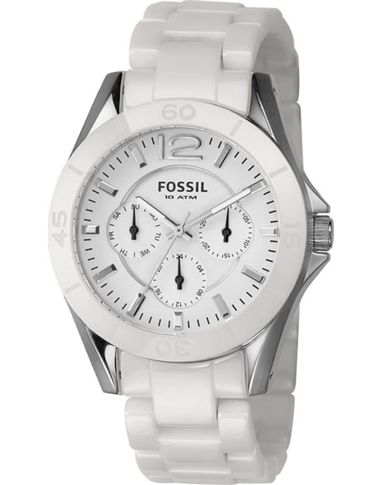 Женские наручные часы Fossil CE1002, кварцевый механизм с высокой точностью. Класс водозащиты: 100 метров, позволит плавать, нырять и заниматься другими водными видами спорта. Корпус часов изготовлен из керамики и стали. Керамический браслет на застёжке-бабочке с кнопкамиЗастёжка "бабочка"Такой вид застёжки дополняется предохранителями, помогающими избежать случайного раскрытия браслета. Обладают изящным исполнением. . Стрелки и метки с люминесцентным покрытиемЛюминесцентное покрытиеПозволяет считывать показания времени в темноте. Производители наносят на стрелки, часовые индексы, безель или поверхность циферблата светонакопительный состав, дающий холодное свечение..