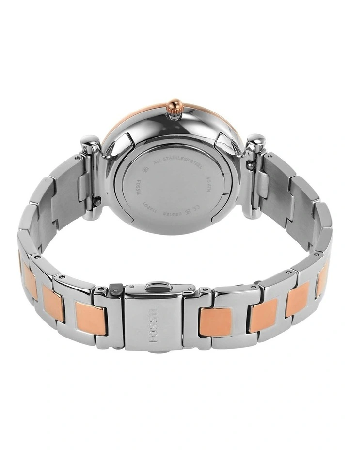 Женские американские часы Fossil Carlie ES5156, кварцевый механизм с высокой точностью. Класс водозащиты: 50 метров, позволит защитить корпус от случайных брызг или капель дождя. Круглый стальной корпус c полированной поверхностью изготовлен из стали с частичным розовым IP-покрытиемIP-покрытиеМетод ионного напыления. Демонстрирует повышенную устойчивость к истиранию, окислению и химическим веществам. Под воздействием высокого давления и температуры около 1500°C молекулы металла надёжно соединяются с частицами корпуса часов.. Центральная часть циферблата украшена декоративным узором. Метки в виде арабских цифр и штрихов с люминесцентной подсветкойЛюминесцентное покрытиеПозволяет считывать показания времени в темноте. Производители наносят на стрелки, часовые индексы, безель или поверхность циферблата светонакопительный состав, дающий холодное свечение.. Окошко даты находится между часовыми отметками 4 и 5. Рифленая заводная головка. Полированный стальной браслет с частичным розовым IP-покрытиемIP-покрытиеМетод ионного напыления. Демонстрирует повышенную устойчивость к истиранию, окислению и химическим веществам. Под воздействием высокого давления и температуры около 1500°C молекулы металла надёжно соединяются с частицами корпуса часов. имеет раскладывающуюся застежкуРаскладная застёжкаТакой тип застёжки используется только на браслетах из металла. Она никогда не раскрывается полностью, происходит разделение на 2 и более частей. Раскладывающая застёжка снизит вероятность потери часов к минимуму..