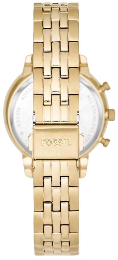 Женские американские часы-хронографХронографФункция позволяет измерять отрезки времени с особой точностью: часы, минуты, секунды. Верным признаком хронографа является наличие на циферблате 3 дополнительных окошек-счётчиков. с секундомеромСекундомерСекундоме́р — прибор, способный измерять интервалы времени с точностью до долей секунды. Fossil Neutra ES5219, кварцевый механизм с высокой точностью. Класс водозащиты: 50 метров, позволит защитить корпус от случайных брызг или капель дождя. Корпус и браслет часов изготовлен из стали с IP-покрытиемIP-покрытиеМетод ионного напыления. Демонстрирует повышенную устойчивость к истиранию, окислению и химическим веществам. Под воздействием высокого давления и температуры около 1500°C молекулы металла надёжно соединяются с частицами корпуса часов. золотистого цвета. Система отображения времени 12-ти и 24-х часового формата. БезельБезельВнешний ободок, закрепляющий стекло. В спортивных часах так называется поворотное кольцо с делениями на циферблате, выполняет роль таймера – замеряет отрезки времени на шкале. Неподвижный безель – элемент декора. Однонаправленно вращающийся безель на дайверских часах позволяет фиксировать моменты погружения и выныривания на поверхность. украшен кристаллами. Окошко даты между 4 и 5 часами.