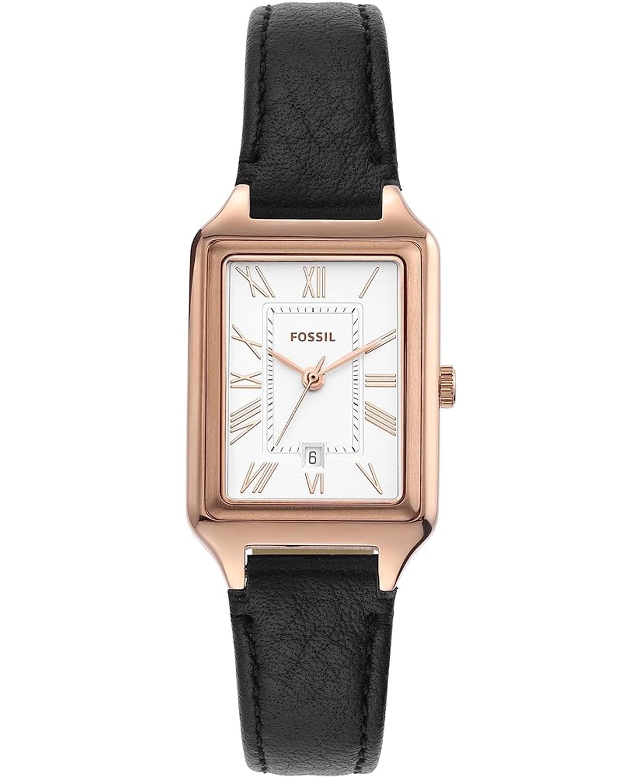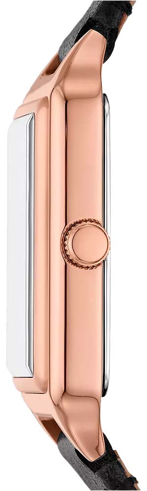 Женские американские часы с минеральным стекломМинеральное стеклоМинеральное стекло представляет собой искусственно выращенный минерал кварца. Такое стекло отличается особой устойчивостью к повреждениям и царапинам. Уступает по некоторым качествам сапфировому стеклу. Fossil Raquel ES5310, кварцевый механизм с высокой точностью. Корпус часов изготовлен из нержавеющей стали с IP-покрытиемIP-покрытиеМетод ионного напыления. Демонстрирует повышенную устойчивость к истиранию, окислению и химическим веществам. Под воздействием высокого давления и температуры около 1500°C молекулы металла надёжно соединяются с частицами корпуса часов.. Класс водозащиты: 50 метров, позволит защитить корпус от случайных брызг или капель дождя. Кожаный ремешок на стандартной застёжке. Окошко даты находится в положении 6 часов.