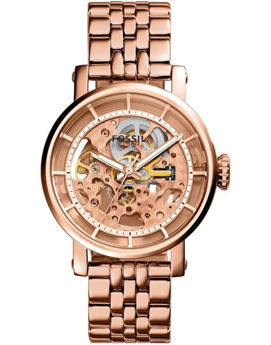 Женские механические наручные часы с автоподзаводом Fossil Original Boyfriend Automatic ME3065. Корпус часов изготовлен из нержавеющей стали. Минеральное стеклоМинеральное стеклоМинеральное стекло представляет собой искусственно выращенный минерал кварца. Такое стекло отличается особой устойчивостью к повреждениям и царапинам. Уступает по некоторым качествам сапфировому стеклу. устойчивое к появлению царапин, обладающее высокой прозрачностью. Водозащита: 50 метров, позволит защитить корпус от случайных брызг или капель дождя. Стальной браслет на раскладной застёжкеРаскладная застёжкаТакой тип застёжки используется только на браслетах из металла. Она никогда не раскрывается полностью, происходит разделение на 2 и более частей. Раскладывающая застёжка снизит вероятность потери часов к минимуму.. Стрелки с люминесцентным покрытиемЛюминесцентное покрытиеПозволяет считывать показания времени в темноте. Производители наносят на стрелки, часовые индексы, безель или поверхность циферблата светонакопительный состав, дающий холодное свечение..