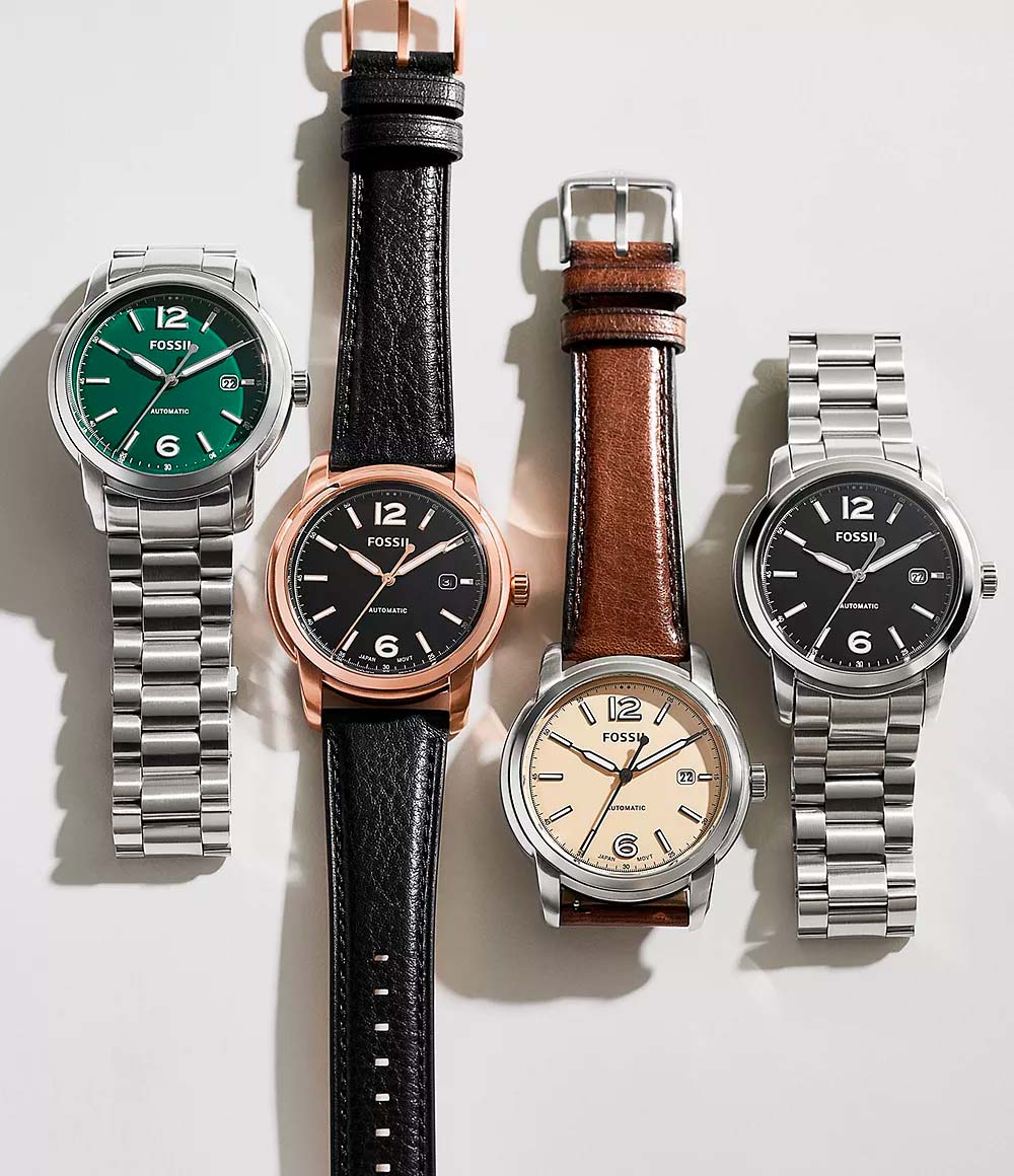 Наручные часы Fossil Heritage ME3223 с надёжным автоматическим механизмом. Корпус и браслет часов изготовлены из нержавеющей стали. Минеральное стеклоМинеральное стеклоМинеральное стекло представляет собой искусственно выращенный минерал кварца. Такое стекло отличается особой устойчивостью к повреждениям и царапинам. Уступает по некоторым качествам сапфировому стеклу. устойчивое к мелким механическим повреждениям. Стальной браслет на раскладной застёжкеРаскладная застёжкаТакой тип застёжки используется только на браслетах из металла. Она никогда не раскрывается полностью, происходит разделение на 2 и более частей. Раскладывающая застёжка снизит вероятность потери часов к минимуму.. Класс водозащиты: 50 метров, позволит защитить корпус от случайных брызг или капель дождя. Стрелки и метки с люминесцентным покрытиемЛюминесцентное покрытиеПозволяет считывать показания времени в темноте. Производители наносят на стрелки, часовые индексы, безель или поверхность циферблата светонакопительный состав, дающий холодное свечение.. Окошко даты находится в положении 3 часа.