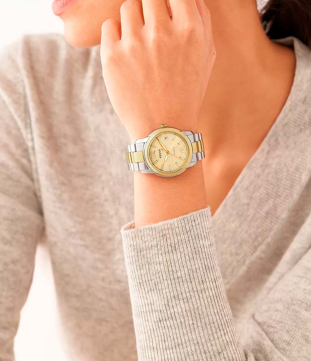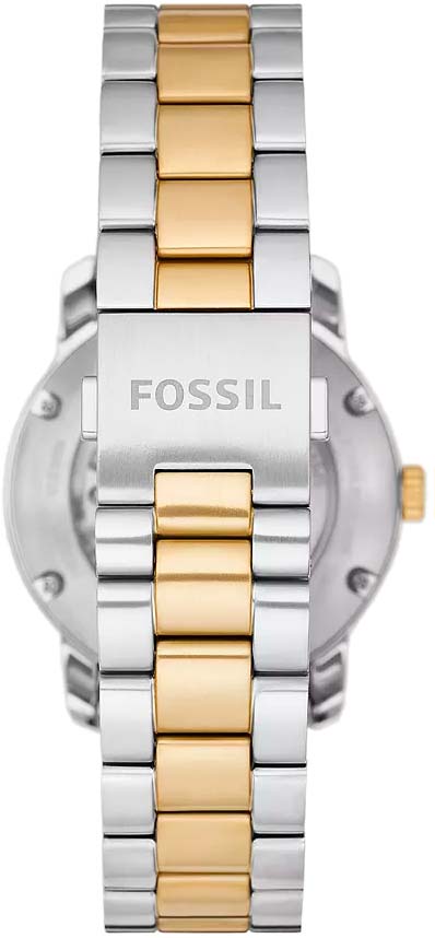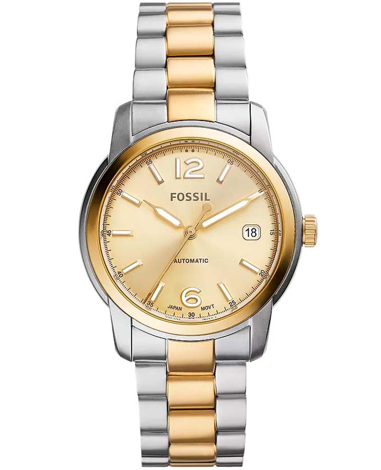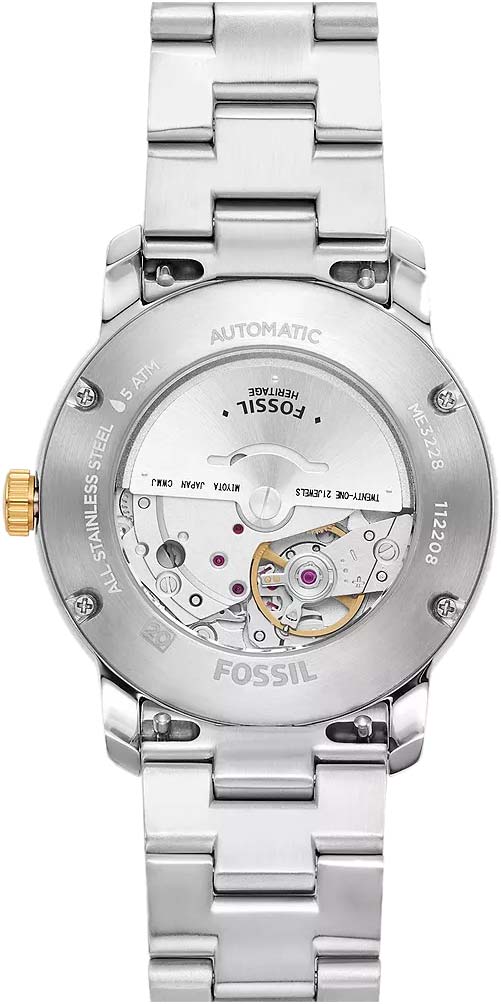 Наручные часы Fossil Heritage ME3228 с надёжным автоматическим механизмом. Корпус и браслет часов изготовлены из нержавеющей стали с частичным IP-покрытиемIP-покрытиеМетод ионного напыления. Демонстрирует повышенную устойчивость к истиранию, окислению и химическим веществам. Под воздействием высокого давления и температуры около 1500°C молекулы металла надёжно соединяются с частицами корпуса часов.. Минеральное стеклоМинеральное стеклоМинеральное стекло представляет собой искусственно выращенный минерал кварца. Такое стекло отличается особой устойчивостью к повреждениям и царапинам. Уступает по некоторым качествам сапфировому стеклу. устойчивое к мелким механическим повреждениям. Стальной браслет на раскладной застёжкеРаскладная застёжкаТакой тип застёжки используется только на браслетах из металла. Она никогда не раскрывается полностью, происходит разделение на 2 и более частей. Раскладывающая застёжка снизит вероятность потери часов к минимуму.. Класс водозащиты: 50 метров, позволит защитить корпус от случайных брызг или капель дождя. Стрелки и метки с люминесцентным покрытиемЛюминесцентное покрытиеПозволяет считывать показания времени в темноте. Производители наносят на стрелки, часовые индексы, безель или поверхность циферблата светонакопительный состав, дающий холодное свечение.. Окошко даты находится в положении 3 часа.