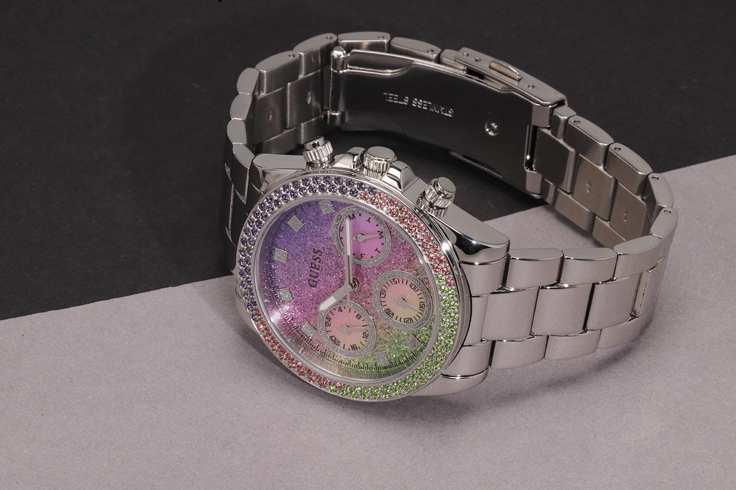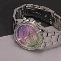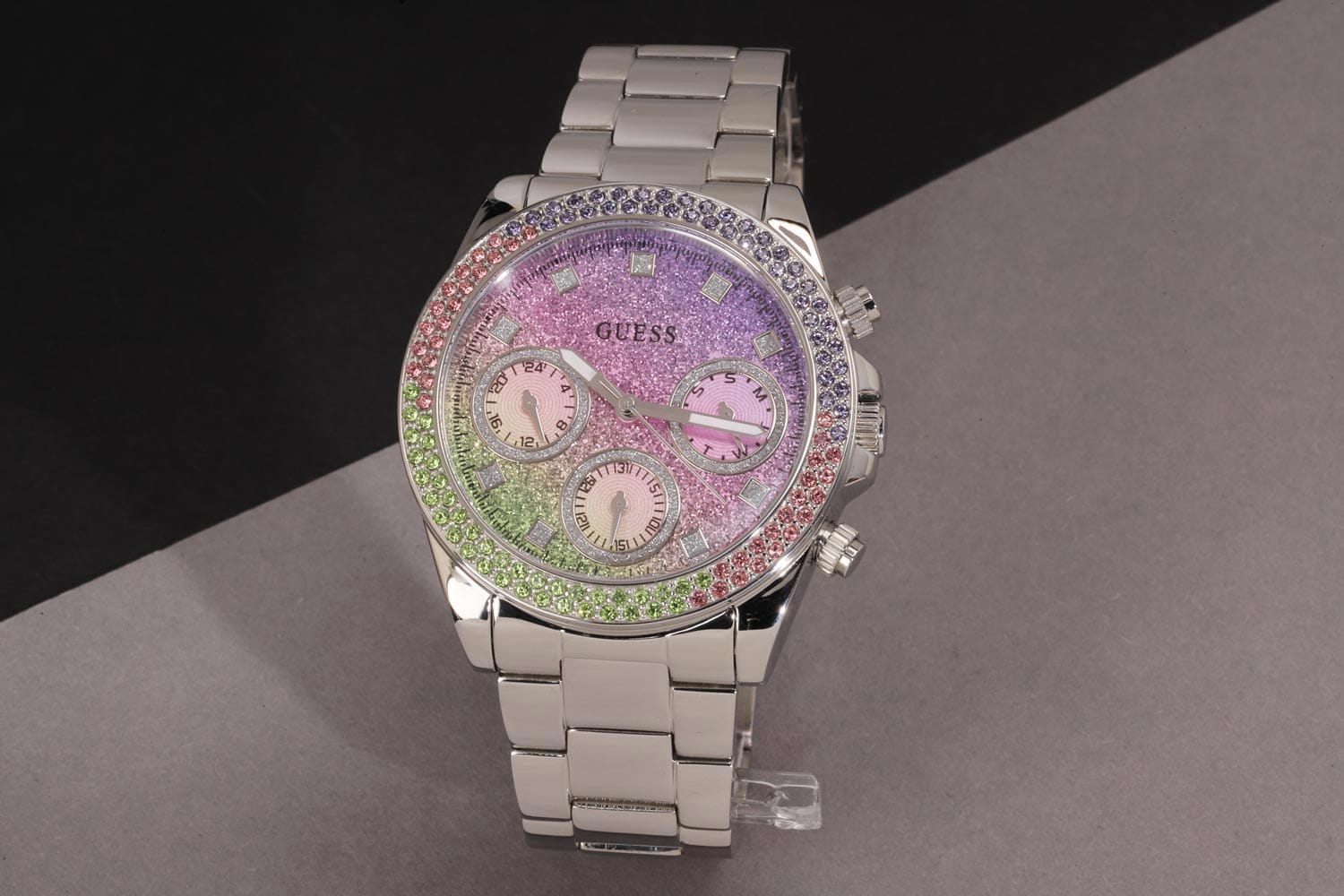 Безукоризненный функциональный аксессуар, сотканный из стали и разноцветных кристаллов, покорит ваше сердце с первого взгляда. Блистательные женские часы Sol. Круглый стальной корпус украшенный кристаллами. Глиттерный циферблат с метками в виде точек из кристаллов, защинен минеральным стекломМинеральное стеклоМинеральное стекло представляет собой искусственно выращенный минерал кварца. Такое стекло отличается особой устойчивостью к повреждениям и царапинам. Уступает по некоторым качествам сапфировому стеклу.. 12-ти и 24-х часовой формат времени. Дата и день недели вынесены на отдельные циферблаты. Рифленая заводная головка с защитой. Стальной браслет с раскладной застёжкойРаскладная застёжкаТакой тип застёжки используется только на браслетах из металла. Она никогда не раскрывается полностью, происходит разделение на 2 и более частей. Раскладывающая застёжка снизит вероятность потери часов к минимуму.