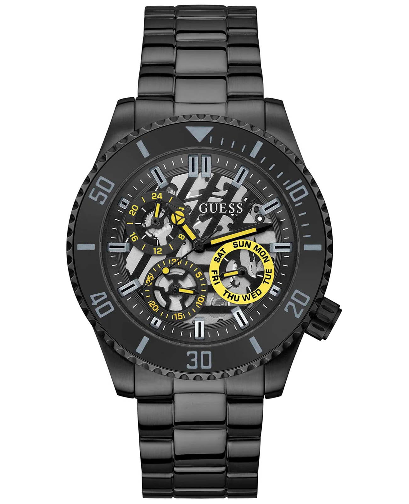 Мужские наручные часы с минеральным стекломМинеральное стеклоМинеральное стекло представляет собой искусственно выращенный минерал кварца. Такое стекло отличается особой устойчивостью к повреждениям и царапинам. Уступает по некоторым качествам сапфировому стеклу. Guess Axle GW0488G3, кварцевый механизм с высокой точностью. Класс водозащиты: 50 метров, позволит защитить корпус от случайных брызг или капель дождя. Корпус часов изготовлен из стали с IP-покрытиемIP-покрытиеМетод ионного напыления. Демонстрирует повышенную устойчивость к истиранию, окислению и химическим веществам. Под воздействием высокого давления и температуры около 1500°C молекулы металла надёжно соединяются с частицами корпуса часов.. Стальной браслет на раскладной застёжкеРаскладная застёжкаТакой тип застёжки используется только на браслетах из металла. Она никогда не раскрывается полностью, происходит разделение на 2 и более частей. Раскладывающая застёжка снизит вероятность потери часов к минимуму. с IP-покрытиемIP-покрытиеМетод ионного напыления. Демонстрирует повышенную устойчивость к истиранию, окислению и химическим веществам. Под воздействием высокого давления и температуры около 1500°C молекулы металла надёжно соединяются с частицами корпуса часов.. Стрелки с люминесцентным покрытиемЛюминесцентное покрытиеПозволяет считывать показания времени в темноте. Производители наносят на стрелки, часовые индексы, безель или поверхность циферблата светонакопительный состав, дающий холодное свечение.. 12-ти и 24-х часовой формат времени. Дата и день недели вынесены на отдельные циферблаты. Смещенная рифленая заводная головка с защитой.