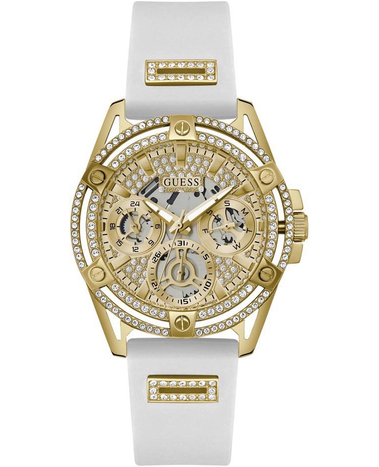 Женские наручные часы-скелетоны с минеральным стекломМинеральное стеклоМинеральное стекло представляет собой искусственно выращенный минерал кварца. Такое стекло отличается особой устойчивостью к повреждениям и царапинам. Уступает по некоторым качествам сапфировому стеклу. Guess Queen GW0536L2, кварцевый механизм с высокой точностью. Класс водозащиты: 30 метров, позволит защитить корпус от случайных брызг или капель дождя. Корпус часов изготовлен из стали с IP-покрытиемIP-покрытиеМетод ионного напыления. Демонстрирует повышенную устойчивость к истиранию, окислению и химическим веществам. Под воздействием высокого давления и температуры около 1500°C молекулы металла надёжно соединяются с частицами корпуса часов.. Силиконовый ремешок на стандартной застёжке. 24-х часовой формат времени, дата и день недели вынесены на отдельные циферблаты. Метки в виде штрихов. Рифленая заводная головка с защитой. Циферблат и ремешок украшены кристаллами.Стрелки с люминесцентным покрытиемЛюминесцентное покрытиеПозволяет считывать показания времени в темноте. Производители наносят на стрелки, часовые индексы, безель или поверхность циферблата светонакопительный состав, дающий холодное свечение..