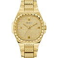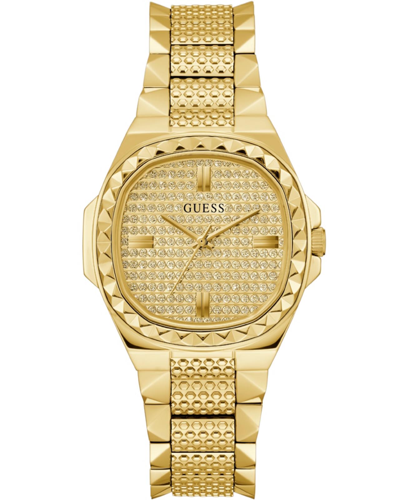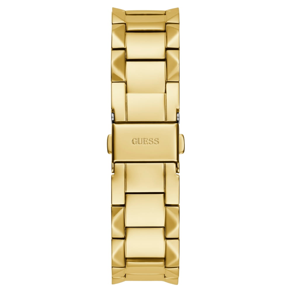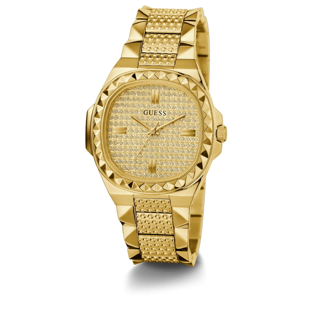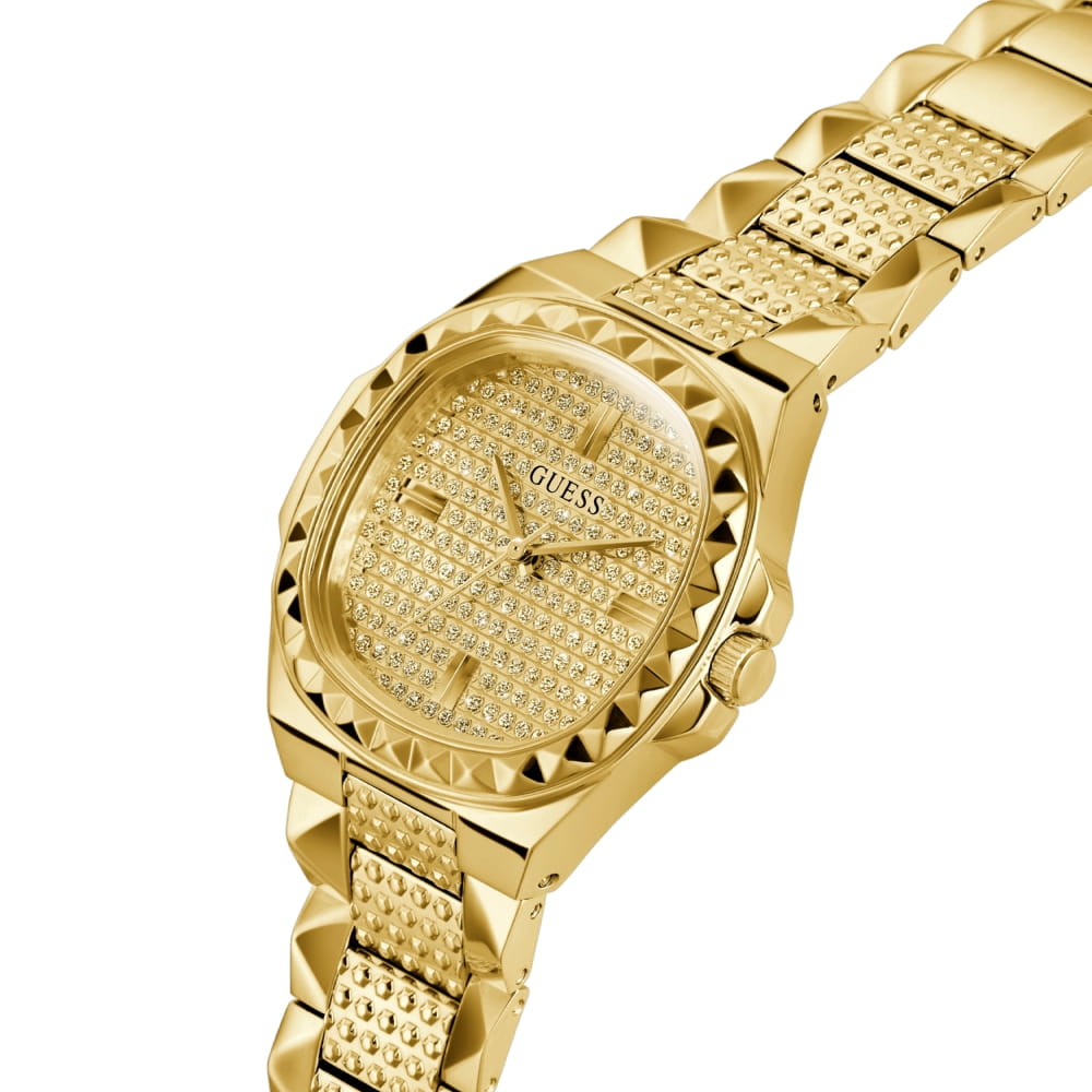 Женские наручные часы с минеральным стекломМинеральное стеклоМинеральное стекло представляет собой искусственно выращенный минерал кварца. Такое стекло отличается особой устойчивостью к повреждениям и царапинам. Уступает по некоторым качествам сапфировому стеклу. Guess Lady Idol GW0601L1, кварцевый механизм с высокой точностью. Класс водозащиты: 30 метров, позволит защитить корпус от случайных брызг или капель дождя. Корпус часов изготовлен из стали с IP-покрытиемIP-покрытиеМетод ионного напыления. Демонстрирует повышенную устойчивость к истиранию, окислению и химическим веществам. Под воздействием высокого давления и температуры около 1500°C молекулы металла надёжно соединяются с частицами корпуса часов.. Стальной браслет на раскладной застёжкеРаскладная застёжкаТакой тип застёжки используется только на браслетах из металла. Она никогда не раскрывается полностью, происходит разделение на 2 и более частей. Раскладывающая застёжка снизит вероятность потери часов к минимуму. с IP-покрытиемIP-покрытиеМетод ионного напыления. Демонстрирует повышенную устойчивость к истиранию, окислению и химическим веществам. Под воздействием высокого давления и температуры около 1500°C молекулы металла надёжно соединяются с частицами корпуса часов.. БезельБезельВнешний ободок, закрепляющий стекло. В спортивных часах так называется поворотное кольцо с делениями на циферблате, выполняет роль таймера – замеряет отрезки времени на шкале. Неподвижный безель – элемент декора. Однонаправленно вращающийся безель на дайверских часах позволяет фиксировать моменты погружения и выныривания на поверхность. инкрустирован кристаллами.