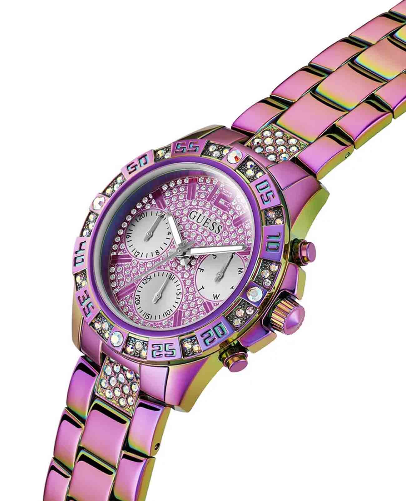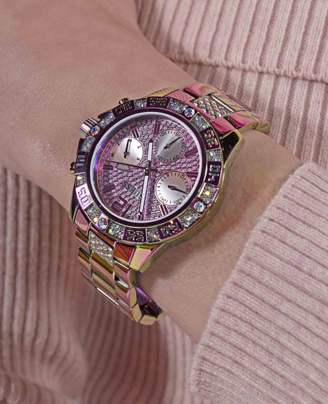 Женские наручные часы Guess Dress GW0771L4 с минеральным стекломМинеральное стеклоМинеральное стекло представляет собой искусственно выращенный минерал кварца. Такое стекло отличается особой устойчивостью к повреждениям и царапинам. Уступает по некоторым качествам сапфировому стеклу., кварцевый механизм с высокой точностью. Корпус часов изготовлен из стали с IP-покрытиемIP-покрытиеМетод ионного напыления. Демонстрирует повышенную устойчивость к истиранию, окислению и химическим веществам. Под воздействием высокого давления и температуры около 1500°C молекулы металла надёжно соединяются с частицами корпуса часов.. БезельБезельВнешний ободок, закрепляющий стекло. В спортивных часах так называется поворотное кольцо с делениями на циферблате, выполняет роль таймера – замеряет отрезки времени на шкале. Неподвижный безель – элемент декора. Однонаправленно вращающийся безель на дайверских часах позволяет фиксировать моменты погружения и выныривания на поверхность. с IP-покрытиемIP-покрытиеМетод ионного напыления. Демонстрирует повышенную устойчивость к истиранию, окислению и химическим веществам. Под воздействием высокого давления и температуры около 1500°C молекулы металла надёжно соединяются с частицами корпуса часов. украшен кристаллами. Стрелки с люминесцентным покрытиемЛюминесцентное покрытиеПозволяет считывать показания времени в темноте. Производители наносят на стрелки, часовые индексы, безель или поверхность циферблата светонакопительный состав, дающий холодное свечение.. Класс водозащиты: 50 метров, позволит защитить корпус от случайных брызг или капель дождя. Стальной браслет с IP-покрытиемIP-покрытиеМетод ионного напыления. Демонстрирует повышенную устойчивость к истиранию, окислению и химическим веществам. Под воздействием высокого давления и температуры около 1500°C молекулы металла надёжно соединяются с частицами корпуса часов. на раскладной застёжкеРаскладная застёжкаТакой тип застёжки используется только на браслетах из металла. Она никогда не раскрывается полностью, происходит разделение на 2 и более частей. Раскладывающая застёжка снизит вероятность потери часов к минимуму..