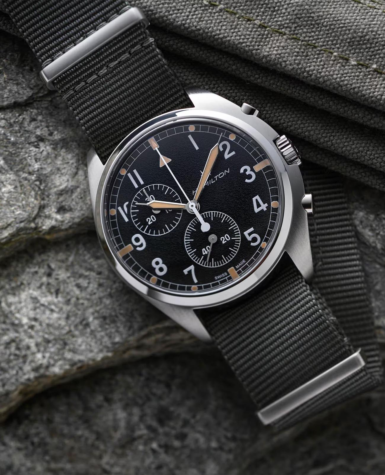 Мужские швейцарские часы-хронографХронографФункция позволяет измерять отрезки времени с особой точностью: часы, минуты, секунды. Верным признаком хронографа является наличие на циферблате 3 дополнительных окошек-счётчиков. с секундомеромСекундомерСекундоме́р — прибор, способный измерять интервалы времени с точностью до долей секунды. и надёжным кварцевым механизмом Hamilton Khaki Aviation Pilot Pioneer Chrono Quartz H76522931. Сапфировое стеклоСапфировое стеклоПрочный и надёжный материал из кристалла сапфира синтетического происхождения, характеризующийся особой твёрдостью и устойчивостью к царапинам и повреждениям. устойчивое к появлению царапин, обладающее высокой прозрачностью. Класс водозащиты: 100 метров, позволит плавать, нырять и заниматься другими водными видами спорта. Корпус часов изготовлен из стали. Тканевый ремешок на стандартной застёжке. Стрелки и метки с люминесцентным покрытиемЛюминесцентное покрытиеПозволяет считывать показания времени в темноте. Производители наносят на стрелки, часовые индексы, безель или поверхность циферблата светонакопительный состав, дающий холодное свечение..
