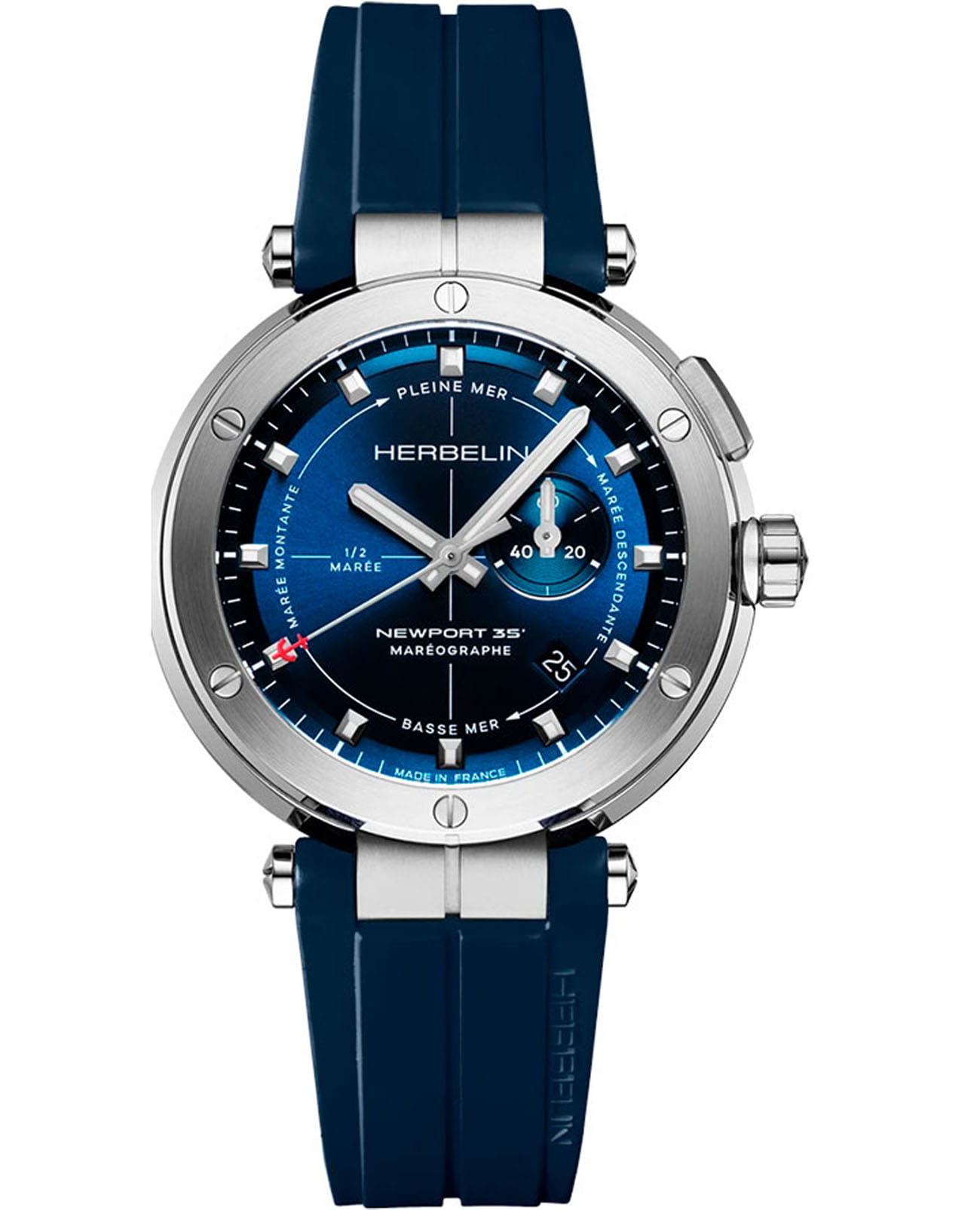 Мужские кварцевые часы Herbelin Newport Mareograph 24688A15CB – отражающий идеальное сочетание современного дизайна, надёжности и функциональности. Элегантный облик станет превосходным завершением образа, наделив его индивидуальным характером. Корпус из нержавеющей стали 316L серебристого цвета идеально сбалансирован и элегантен. Сапфировое стеклоСапфировое стеклоПрочный и надёжный материал из кристалла сапфира синтетического происхождения, характеризующийся особой твёрдостью и устойчивостью к царапинам и повреждениям. защищает циферблат от царапин и устойчивое к механическим повреждениям. Серая стрелка с красным кончиком указывает на прилив или отлив согласно показаниям внизу. Кнопка в положении «2 часа» управляет стрелкой индикатора прилива. Окошко даты находится в положении между 4 и 5 часами. Стрелки и метки с люминесцентным покрытиемЛюминесцентное покрытиеПозволяет считывать показания времени в темноте. Производители наносят на стрелки, часовые индексы, безель или поверхность циферблата светонакопительный состав, дающий холодное свечение., обеспечивающим хорошую читаемость в темноте. Синий каучуковый ремешок на застёжке-бабочке с кнопкамиЗастёжка "бабочка"Такой вид застёжки дополняется предохранителями, помогающими избежать случайного раскрытия браслета. Обладают изящным исполнением. обеспечивает комфортное ношение. Водозащита 100 метров, позволит плавать, нырять и заниматься другими водными видами спорта. Эта модель – отличный выбор для тех, кто ищет сочетание стиля, качества и функциональности. Часы станут не только полезным аксессуаром, но и выразительным элементом вашего имиджа.