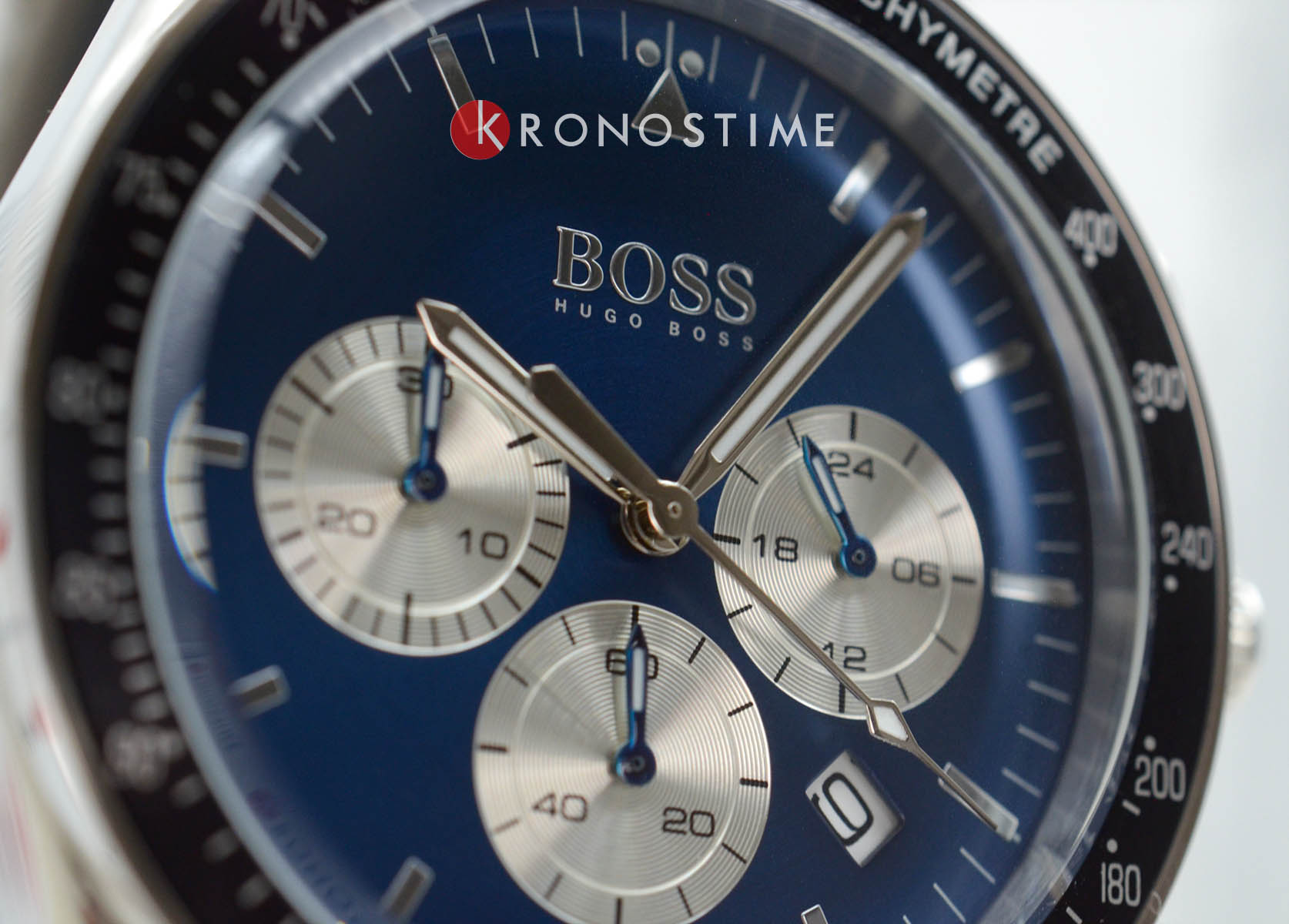 Мужские кварцевые часы Hugo Boss Trophy HB1513630 представляют собой стильную модель с корпусом диаметром 44 мм из нержавеющей стали с неподвижным безелемБезельВнешний ободок, закрепляющий стекло. В спортивных часах так называется поворотное кольцо с делениями на циферблате, выполняет роль таймера – замеряет отрезки времени на шкале. Неподвижный безель – элемент декора. Однонаправленно вращающийся безель на дайверских часах позволяет фиксировать моменты погружения и выныривания на поверхность. с IP-покрытиемIP-покрытиеМетод ионного напыления. Демонстрирует повышенную устойчивость к истиранию, окислению и химическим веществам. Под воздействием высокого давления и температуры около 1500°C молекулы металла надёжно соединяются с частицами корпуса часов., дополненным синим изысканным циферблатом. Модель оснащена высокоточным кварцевым механизмом с функцией хронографаХронографФункция позволяет измерять отрезки времени с особой точностью: часы, минуты, секунды. Верным признаком хронографа является наличие на циферблате 3 дополнительных окошек-счётчиков., включая 60-минутный счетчик, а также индикацию даты. Циферблат защищен устойчивым к царапинам минеральным стекломМинеральное стеклоМинеральное стекло представляет собой искусственно выращенный минерал кварца. Такое стекло отличается особой устойчивостью к повреждениям и царапинам. Уступает по некоторым качествам сапфировому стеклу., а водонепроницаемость 5 ATM (50 метров) обеспечивает защиту от брызг и дождя. Стальной браслет с раскладной застежкойРаскладная застёжкаТакой тип застёжки используется только на браслетах из металла. Она никогда не раскрывается полностью, происходит разделение на 2 и более частей. Раскладывающая застёжка снизит вероятность потери часов к минимуму. обеспечивает надежную посадку на запястье, а тахиметрическая шкалаТахиметрРазмеченная шкала, располагается на ободке или безеле часов. Тахиметр позволяет рассчитать скорость на определённом участке пути, расстояние измеряется в километрах или милях. позволяет производить расчеты скорости. Люминесцентное покрытиеЛюминесцентное покрытиеПозволяет считывать показания времени в темноте. Производители наносят на стрелки, часовые индексы, безель или поверхность циферблата светонакопительный состав, дающий холодное свечение. обеспечивает отличную видимость в темноте.Точность хода составляет ±15 секунд в месяц, что соответствует стандартам кварцевых механизмов. Дизайн модели сочетает спортивную функциональность с элегантным стилем, характерным для коллекции Trophy.