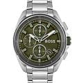Мужские часы Hugo Boss Volane HB 1513951 представлены в круглом 44-мм корпусе из нержавеющей стали. Оснащены кварцевым механизмом с функциями хронографаХронографФункция позволяет измерять отрезки времени с особой точностью: часы, минуты, секунды. Верным признаком хронографа является наличие на циферблате 3 дополнительных окошек-счётчиков. и секундомеромСекундомерСекундоме́р — прибор, способный измерять интервалы времени с точностью до долей секунды.. Зеленый циферблат защищен устойчивым к царапинам минеральным стекломМинеральное стеклоМинеральное стекло представляет собой искусственно выращенный минерал кварца. Такое стекло отличается особой устойчивостью к повреждениям и царапинам. Уступает по некоторым качествам сапфировому стеклу.. Стальной браслет серебристого цвета дополнен раскладной застёжкойРаскладная застёжкаТакой тип застёжки используется только на браслетах из металла. Она никогда не раскрывается полностью, происходит разделение на 2 и более частей. Раскладывающая застёжка снизит вероятность потери часов к минимуму., а стрелки покрыты люминесцентным составомЛюминесцентное покрытиеПозволяет считывать показания времени в темноте. Производители наносят на стрелки, часовые индексы, безель или поверхность циферблата светонакопительный состав, дающий холодное свечение. для видимости в темноте. Водонепроницаемость 100 метров (10 ATM) позволяет использовать часы для плавания.