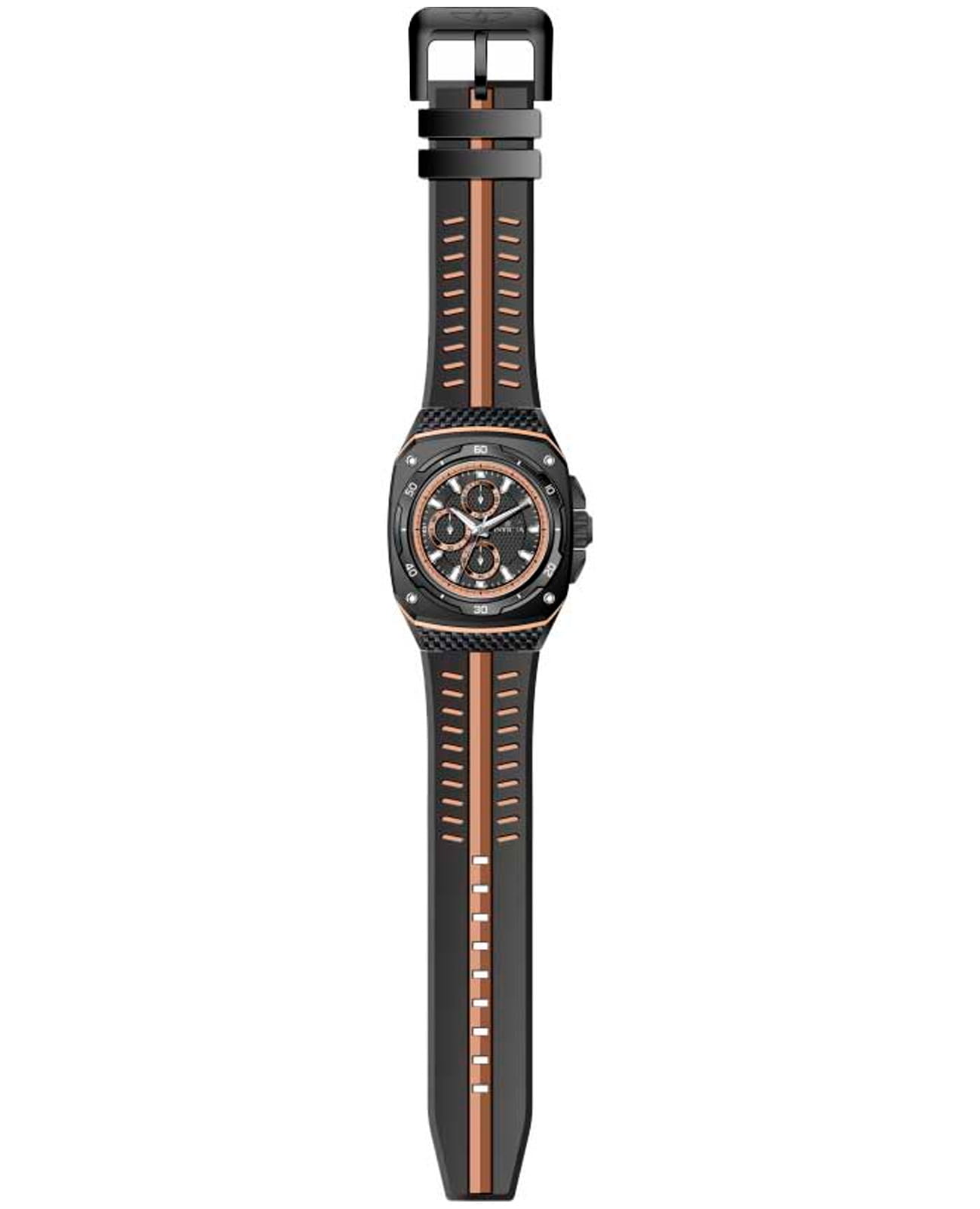 Мужские наручные часы-хронографХронографФункция позволяет измерять отрезки времени с особой точностью: часы, минуты, секунды. Верным признаком хронографа является наличие на циферблате 3 дополнительных окошек-счётчиков. Invicta IN46105 из коллекции Speedway сочетают в себе спортивный дизайн и надежность современных технологий. Модель обладает круглым корпусом диаметром 46 мм, изготовленным из стали с IP-покрытиемIP-покрытиеМетод ионного напыления. Демонстрирует повышенную устойчивость к истиранию, окислению и химическим веществам. Под воздействием высокого давления и температуры около 1500°C молекулы металла надёжно соединяются с частицами корпуса часов., что обеспечивает привлекательный внешний вид и устойчивость к коррозии . Ремешок выполнен из силикона шириной 3 см, гарантируя комфортное ношение . Черный циферблат с метками в виде штрихов оснащен люминесцентным покрытиемЛюминесцентное покрытиеПозволяет считывать показания времени в темноте. Производители наносят на стрелки, часовые индексы, безель или поверхность циферблата светонакопительный состав, дающий холодное свечение., что обеспечивает хорошую видимость в темноте . Для защиты используется минеральное стеклоМинеральное стеклоМинеральное стекло представляет собой искусственно выращенный минерал кварца. Такое стекло отличается особой устойчивостью к повреждениям и царапинам. Уступает по некоторым качествам сапфировому стеклу., обеспечивающее прочную защиту от царапин . Часы работают на кварцевом механизме, что гарантирует точное время без необходимости подзаводки. Модель также является хронографомХронографФункция позволяет измерять отрезки времени с особой точностью: часы, минуты, секунды. Верным признаком хронографа является наличие на циферблате 3 дополнительных окошек-счётчиков., оснащенным функцией секундомераСекундомерСекундоме́р — прибор, способный измерять интервалы времени с точностью до долей секунды., делая ее идеальной для активного образа жизни . Водонепроницаемость часов достигает 50 метров (5 атмосфер), что позволяет использовать их во время мытья рук или дождя, однако не рекомендуется для плавания или дайвинга .