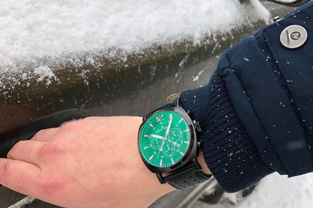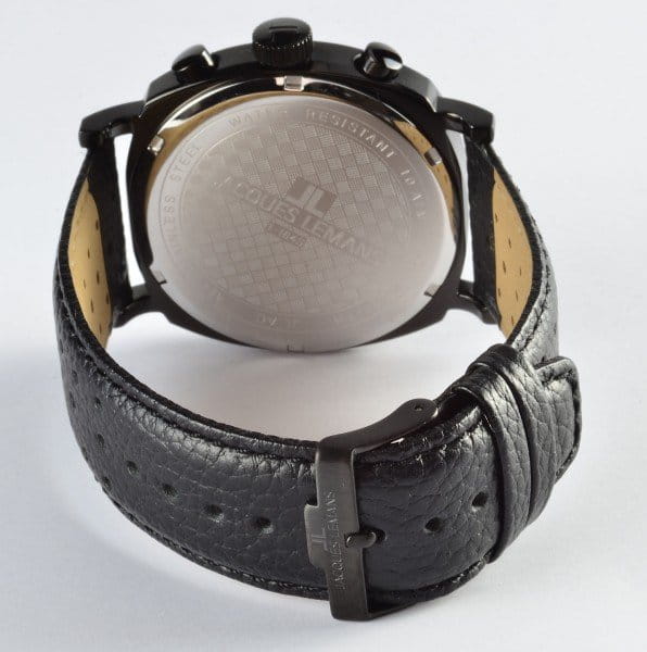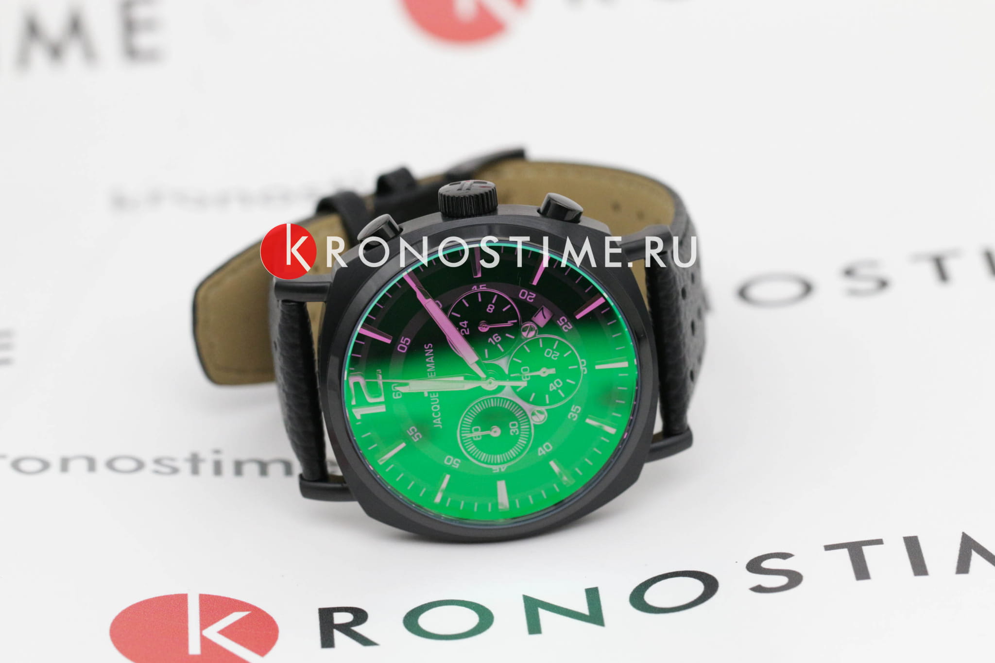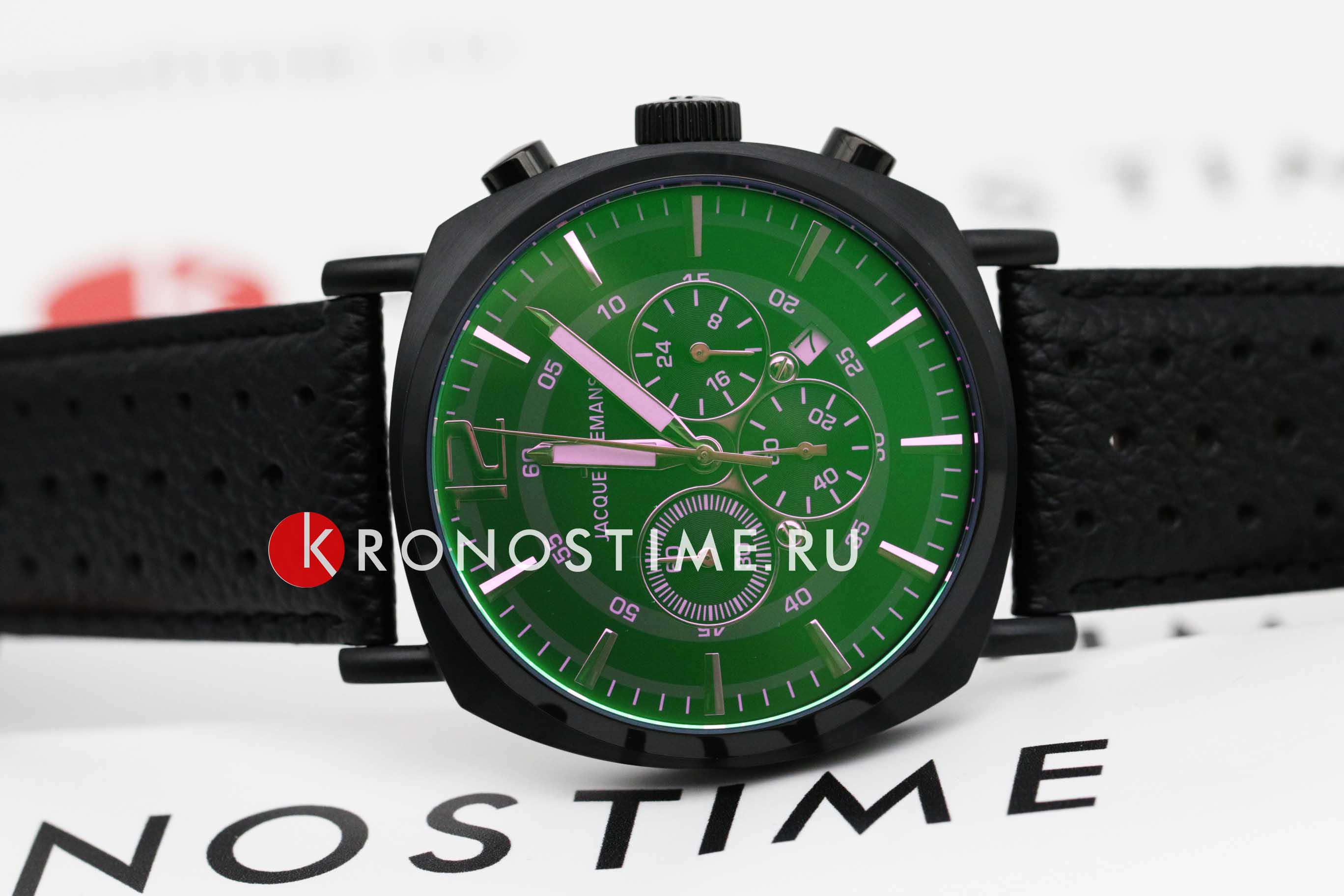 Мужские наручные часы c хронографомХронографФункция позволяет измерять отрезки времени с особой точностью: часы, минуты, секунды. Верным признаком хронографа является наличие на циферблате 3 дополнительных окошек-счётчиков. Jacques Lemans Sport 1-1645N, кварцевый механизм с высокой точностью. Класс водозащиты: 100 метров, позволит плавать, нырять и заниматься другими водными видами спорта. Корпус часов изготовлен из стали с PVD-покрытиемPVDУльтратонкое покрытие наносится в технике вакуумного напыления, сочетает в себе нитрид титана особой прочности со слоем золота или оксида хрома. Несёт в себе декоративную или защитную функцию.. На широком черном циферблате с полировкой в виде солнечных лучей размещены индикатор 24-х часов, минутный и секундный накопители, окошко даты. Хорошо читаемые стрелки часов и минут с люминесцентным покрытиемЛюминесцентное покрытиеПозволяет считывать показания времени в темноте. Производители наносят на стрелки, часовые индексы, безель или поверхность циферблата светонакопительный состав, дающий холодное свечение., что позволяет легко определить время даже в темноте. В модели установлено ударопрочное минеральное стеклоМинеральное стеклоМинеральное стекло представляет собой искусственно выращенный минерал кварца. Такое стекло отличается особой устойчивостью к повреждениям и царапинам. Уступает по некоторым качествам сапфировому стеклу.-хамелеон Crystex. Завинчивающаяся задняя крышка помогает обеспечить повышенную водостойкость 10 атмосфер. Ремешок черного цвета из натуральной кожи с перфорацией подчеркивает спортивный характер модели, а прошивка продлевает срок его службы.