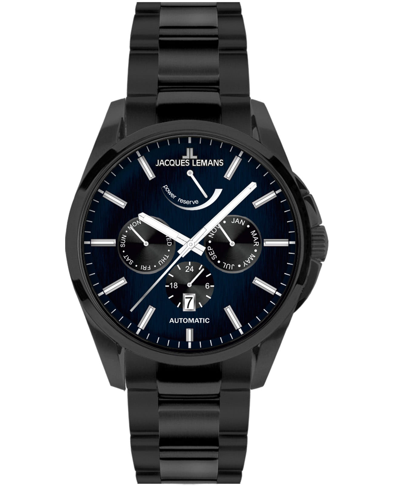 Мужские механические часы с автоподзаводом Jacques Lemans 1-2204D – лаконичная красота и изысканная элегантность. Оригинальная модель с классическим оформлением станет превосходным завершением образа, наделив его индивидуальным характером. Корпус выполнен из нержавеющей стали с PVD-покрытиемPVDУльтратонкое покрытие наносится в технике вакуумного напыления, сочетает в себе нитрид титана особой прочности со слоем золота или оксида хрома. Несёт в себе декоративную или защитную функцию. черного цвета, диаметром 44 мм, что обеспечивает долговечность и утончённый внешний вид. Минеральное стеклоМинеральное стеклоМинеральное стекло представляет собой искусственно выращенный минерал кварца. Такое стекло отличается особой устойчивостью к повреждениям и царапинам. Уступает по некоторым качествам сапфировому стеклу. с сапфировым напылением защищает циферблат от царапин. Стальной браслет на раскладной застёжкеРаскладная застёжкаТакой тип застёжки используется только на браслетах из металла. Она никогда не раскрывается полностью, происходит разделение на 2 и более частей. Раскладывающая застёжка снизит вероятность потери часов к минимуму. обеспечивает комфортное ношение. Водозащита 100 метров позволит плавать, нырять и заниматься другими водными видами спорта. Стрелки и метки с люминесцентным покрытиемЛюминесцентное покрытиеПозволяет считывать показания времени в темноте. Производители наносят на стрелки, часовые индексы, безель или поверхность циферблата светонакопительный состав, дающий холодное свечение. позволяющие легко определять время даже в темноте. Окошко даты находится в положении 6 часов. Индикатор 24-х часов, календарь недели и месяцев вынесены на отдельные циферблаты. Индикация запаса хода в положении 12 часов. Рифленая заводная головка с защитой. Это аксессуар для мужчины, который ценит классический стиль и функциональность.