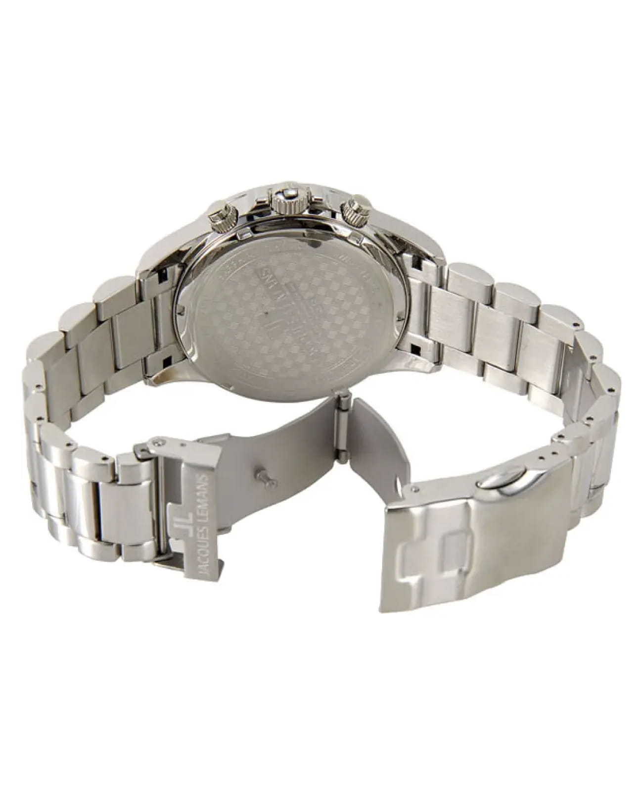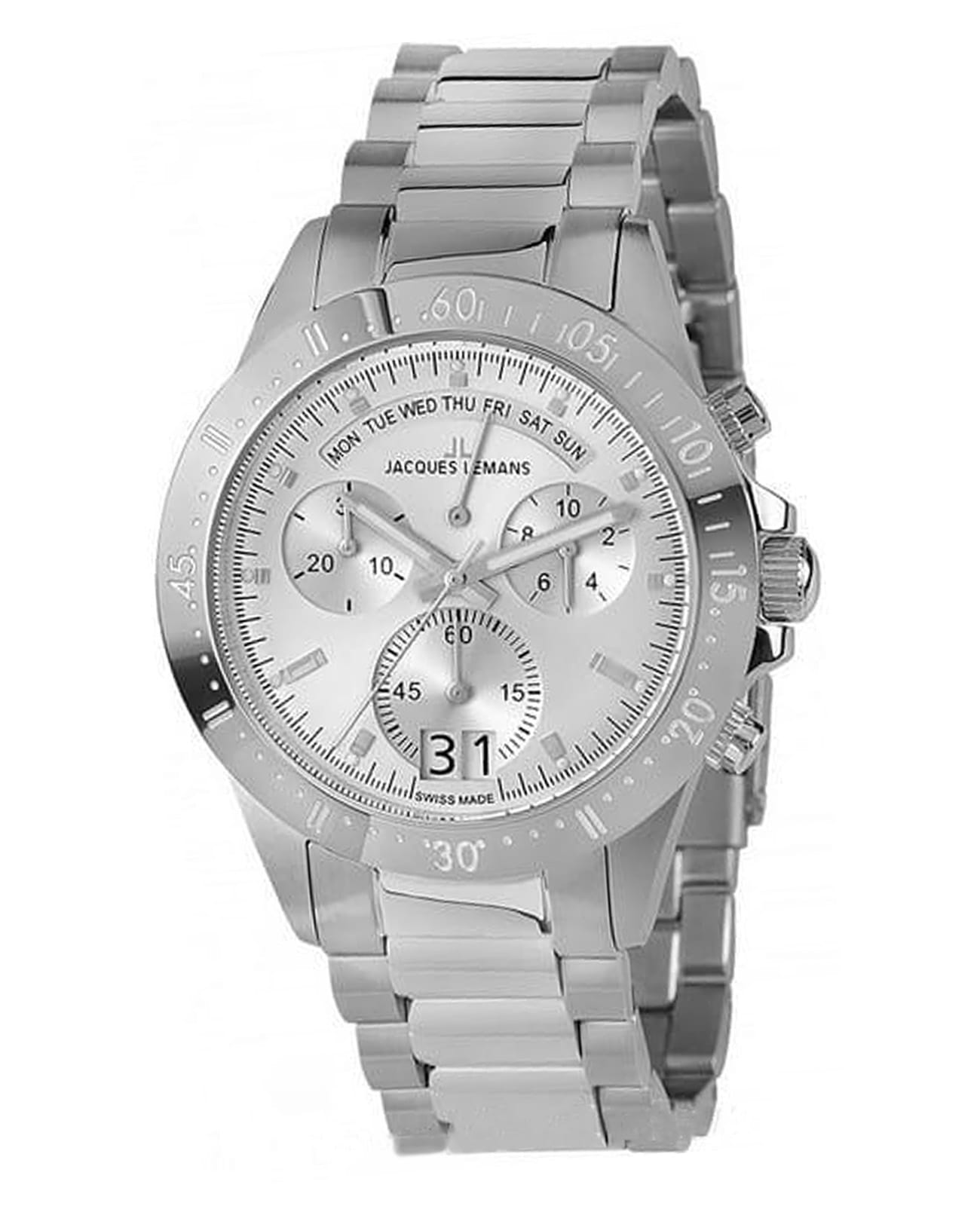 Мужские австрийские часы-хронографХронографФункция позволяет измерять отрезки времени с особой точностью: часы, минуты, секунды. Верным признаком хронографа является наличие на циферблате 3 дополнительных окошек-счётчиков. c секундомеромСекундомерСекундоме́р — прибор, способный измерять интервалы времени с точностью до долей секунды. Jacques Lemans Sport 40-10A, кварцевый механизм с высокой точностью. Минеральное стеклоМинеральное стеклоМинеральное стекло представляет собой искусственно выращенный минерал кварца. Такое стекло отличается особой устойчивостью к повреждениям и царапинам. Уступает по некоторым качествам сапфировому стеклу. устойчивое к мелким механическим повреждениям. Корпус часов изготовлен из стали. Стрелки с люминесцентным покрытиемЛюминесцентное покрытиеПозволяет считывать показания времени в темноте. Производители наносят на стрелки, часовые индексы, безель или поверхность циферблата светонакопительный состав, дающий холодное свечение.. Окошко даты находится в положении 6 часов. Класс водозащиты: 100 метров, позволит плавать, нырять и заниматься другими водными видами спорта. Стальной браслет на раскладной застёжкеРаскладная застёжкаТакой тип застёжки используется только на браслетах из металла. Она никогда не раскрывается полностью, происходит разделение на 2 и более частей. Раскладывающая застёжка снизит вероятность потери часов к минимуму..