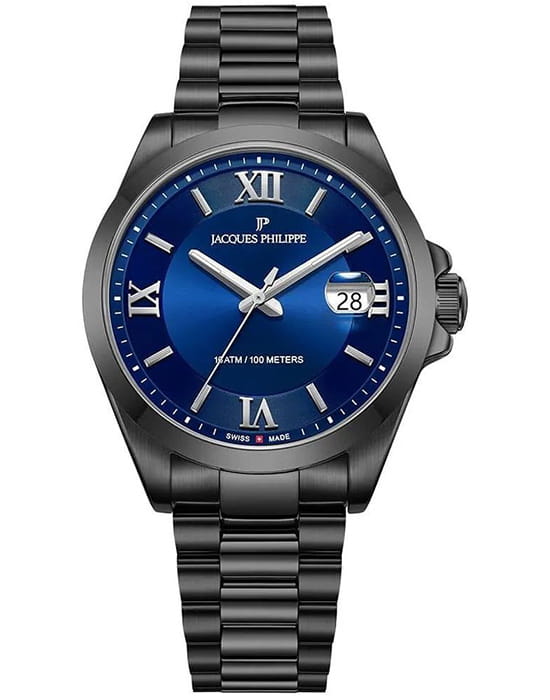 Швейцарские мужские наручные часы Jacques Philippe Infinitum JPQGS338337V2. Надежный кварцевый механизм гарантирует высокую точность отображения времени, позволяя вам всегда быть пунктуальным. Сапфировое стеклоСапфировое стеклоПрочный и надёжный материал из кристалла сапфира синтетического происхождения, характеризующийся особой твёрдостью и устойчивостью к царапинам и повреждениям. с антибликовым покрытиемАнтибликовое покрытиеСлой оксида металла в 0,13-0,3 микрон, благодаря которому стекло часов не бликует и не отражает свет. Антибликовое покрытие уменьшает отражение света в 10 раз, обеспечивая отличную читаемость показателей циферблата. устойчивое к появлению царапин, обладающее высокой прозрачностью и обеспечивает отличную читаемость информации при любом освещении. Корпус из нержавеющей стали 316L с IP-покрытиемIP-покрытиеМетод ионного напыления. Демонстрирует повышенную устойчивость к истиранию, окислению и химическим веществам. Под воздействием высокого давления и температуры около 1500°C молекулы металла надёжно соединяются с частицами корпуса часов. черного цвета, диаметром 40 мм обеспечивает долговечность и устойчивость к внешним воздействиям. Стрелки и метки с люминесцентным покрытиемЛюминесцентное покрытиеПозволяет считывать показания времени в темноте. Производители наносят на стрелки, часовые индексы, безель или поверхность циферблата светонакопительный состав, дающий холодное свечение.. Окошко даты находится в положении 3 часа. Класс водозащиты: 100 метров позволит плавать, нырять и заниматься другими водными видами спорта. Стальной браслет с IP-покрытиемIP-покрытиеМетод ионного напыления. Демонстрирует повышенную устойчивость к истиранию, окислению и химическим веществам. Под воздействием высокого давления и температуры около 1500°C молекулы металла надёжно соединяются с частицами корпуса часов. на застёжке «бабочка» с кнопкамиЗастёжка "бабочка"Такой вид застёжки дополняется предохранителями, помогающими избежать случайного раскрытия браслета. Обладают изящным исполнением. обеспечивает комфортное ношение. Часы подходят для повседневного ношения, деловых встреч и особых случаев, добавляя вашему образу завершенности и элегантности.