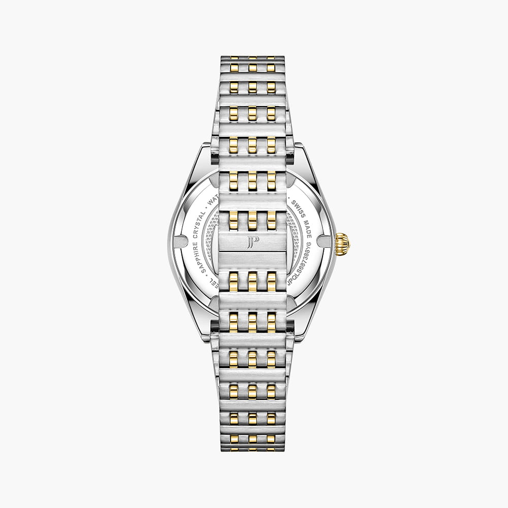 Jacques Philippe Radiante JPQLS687388YG — изящная женская модель коллекции Radiante с кварцевым механизмом, сочетающая классический стиль и практичность. Корпус диаметром 33 мм выполнен из нержавеющей стали и полированными поверхностями, безельБезельВнешний ободок, закрепляющий стекло. В спортивных часах так называется поворотное кольцо с делениями на циферблате, выполняет роль таймера – замеряет отрезки времени на шкале. Неподвижный безель – элемент декора. Однонаправленно вращающийся безель на дайверских часах позволяет фиксировать моменты погружения и выныривания на поверхность. с PVDPVDУльтратонкое покрытие наносится в технике вакуумного напыления, сочетает в себе нитрид титана особой прочности со слоем золота или оксида хрома. Несёт в себе декоративную или защитную функцию. инкрустирован кристаллами, что придаёт часам утончённый блеск. Водозащита до 5 атм (50 м) позволяет носить модель в повседневных условиях. Выпуклое сапфировое стеклоСапфировое стеклоПрочный и надёжный материал из кристалла сапфира синтетического происхождения, характеризующийся особой твёрдостью и устойчивостью к царапинам и повреждениям. обеспечивает защиту от царапин и сохраняет высокую прозрачность, делая циферблат легко читаемым. Модель оснащена точным швейцарским кварцевым механизмом с индикацией часов, минут и секунд. Циферблат оформлен в лаконичном стиле с аккуратными метками, а браслет из нержавеющей стали с частичным PVDPVDУльтратонкое покрытие наносится в технике вакуумного напыления, сочетает в себе нитрид титана особой прочности со слоем золота или оксида хрома. Несёт в себе декоративную или защитную функцию.-покрытием гармонично завершает образ, подчёркивая универсальность и элегантность этих часов.