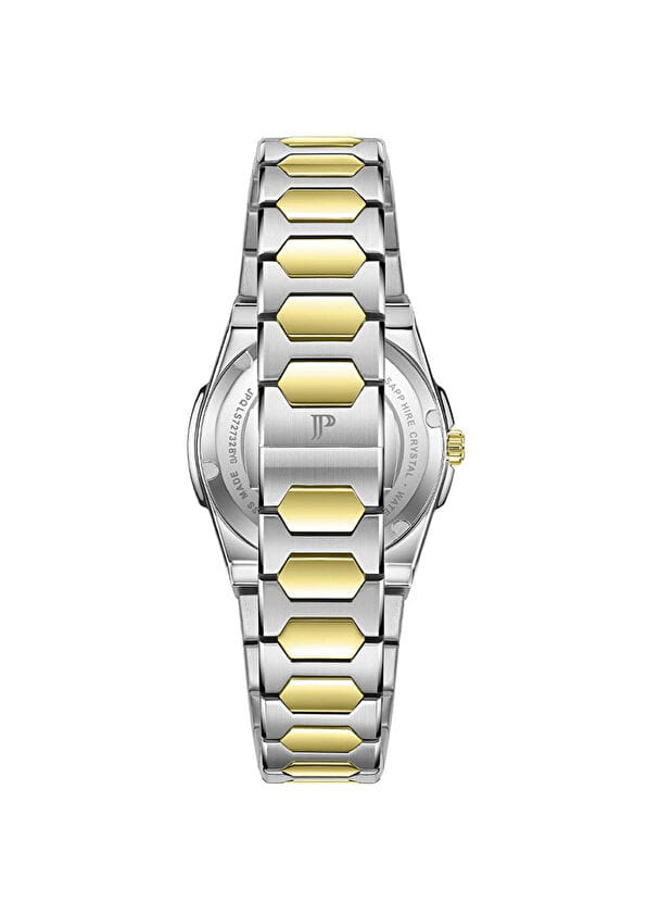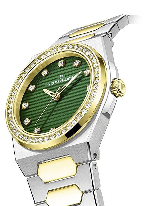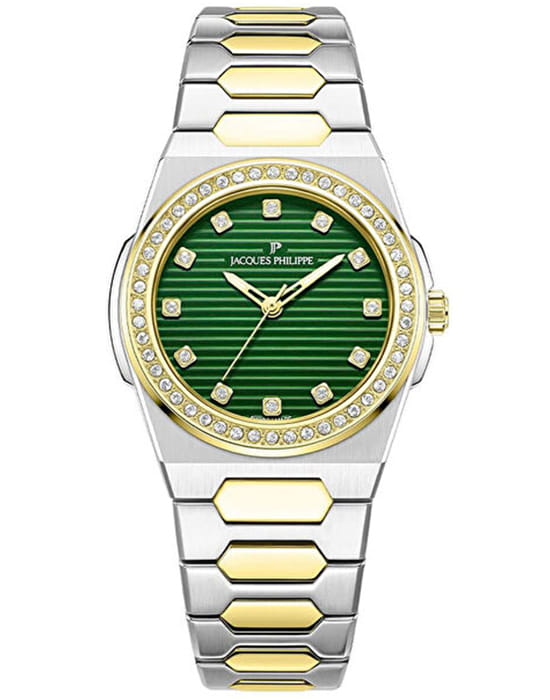 Jacques Philippe Bellus JPQLS7273X8 — изящная женская модель коллекции Bellus с точным кварцевым механизмом Swiss Made, где корпус диаметром 33 мм и толщиной 5 мм выполнен из нержавеющей стали, а безельБезельВнешний ободок, закрепляющий стекло. В спортивных часах так называется поворотное кольцо с делениями на циферблате, выполняет роль таймера – замеряет отрезки времени на шкале. Неподвижный безель – элемент декора. Однонаправленно вращающийся безель на дайверских часах позволяет фиксировать моменты погружения и выныривания на поверхность. с PVDPVDУльтратонкое покрытие наносится в технике вакуумного напыления, сочетает в себе нитрид титана особой прочности со слоем золота или оксида хрома. Несёт в себе декоративную или защитную функцию.-покрытием инкрустирован кристаллами, придающими модели утончённый блеск. Выпуклое сапфировое стеклоСапфировое стеклоПрочный и надёжный материал из кристалла сапфира синтетического происхождения, характеризующийся особой твёрдостью и устойчивостью к царапинам и повреждениям. обеспечивает высокую стойкость к царапинам и сохраняет прозрачность. Водозащита составляет 5 ATM (50 м). Браслет из нержавеющей стали с PVDPVDУльтратонкое покрытие наносится в технике вакуумного напыления, сочетает в себе нитрид титана особой прочности со слоем золота или оксида хрома. Несёт в себе декоративную или защитную функцию.-покрытием гармонично завершает дизайн, подчёркивая элегантность и целостность образа.