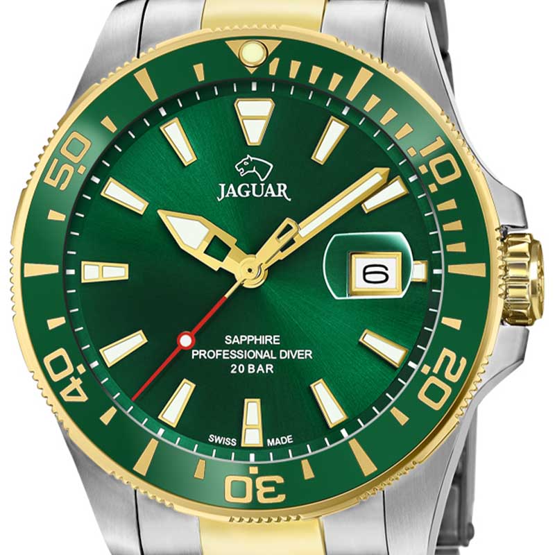 Мужские швейцарские часы Jaguar Executive Diver J863/B. Кварцевый швейцарский калибр Ronda 6003D. Сапфировое стеклоСапфировое стеклоПрочный и надёжный материал из кристалла сапфира синтетического происхождения, характеризующийся особой твёрдостью и устойчивостью к царапинам и повреждениям. устойчивое к мелким механическим повреждениям. Корпус и браслет часов изготовлены из нержавеющей стали. Стрелки и метки с люминесцентным покрытиемЛюминесцентное покрытиеПозволяет считывать показания времени в темноте. Производители наносят на стрелки, часовые индексы, безель или поверхность циферблата светонакопительный состав, дающий холодное свечение.. Окошко даты находится в положении 3 часа. Класс водозащиты: 200 метров, позволит плавать, нырять и заниматься другими водными видами спорта. Стальной браслет с частичным  PVD-покрытиемPVDУльтратонкое покрытие наносится в технике вакуумного напыления, сочетает в себе нитрид титана особой прочности со слоем золота или оксида хрома. Несёт в себе декоративную или защитную функцию. на раскладной застёжкеРаскладная застёжкаТакой тип застёжки используется только на браслетах из металла. Она никогда не раскрывается полностью, происходит разделение на 2 и более частей. Раскладывающая застёжка снизит вероятность потери часов к минимуму.. БезельБезельВнешний ободок, закрепляющий стекло. В спортивных часах так называется поворотное кольцо с делениями на циферблате, выполняет роль таймера – замеряет отрезки времени на шкале. Неподвижный безель – элемент декора. Однонаправленно вращающийся безель на дайверских часах позволяет фиксировать моменты погружения и выныривания на поверхность. с PVD-покрытиемPVDУльтратонкое покрытие наносится в технике вакуумного напыления, сочетает в себе нитрид титана особой прочности со слоем золота или оксида хрома. Несёт в себе декоративную или защитную функцию..