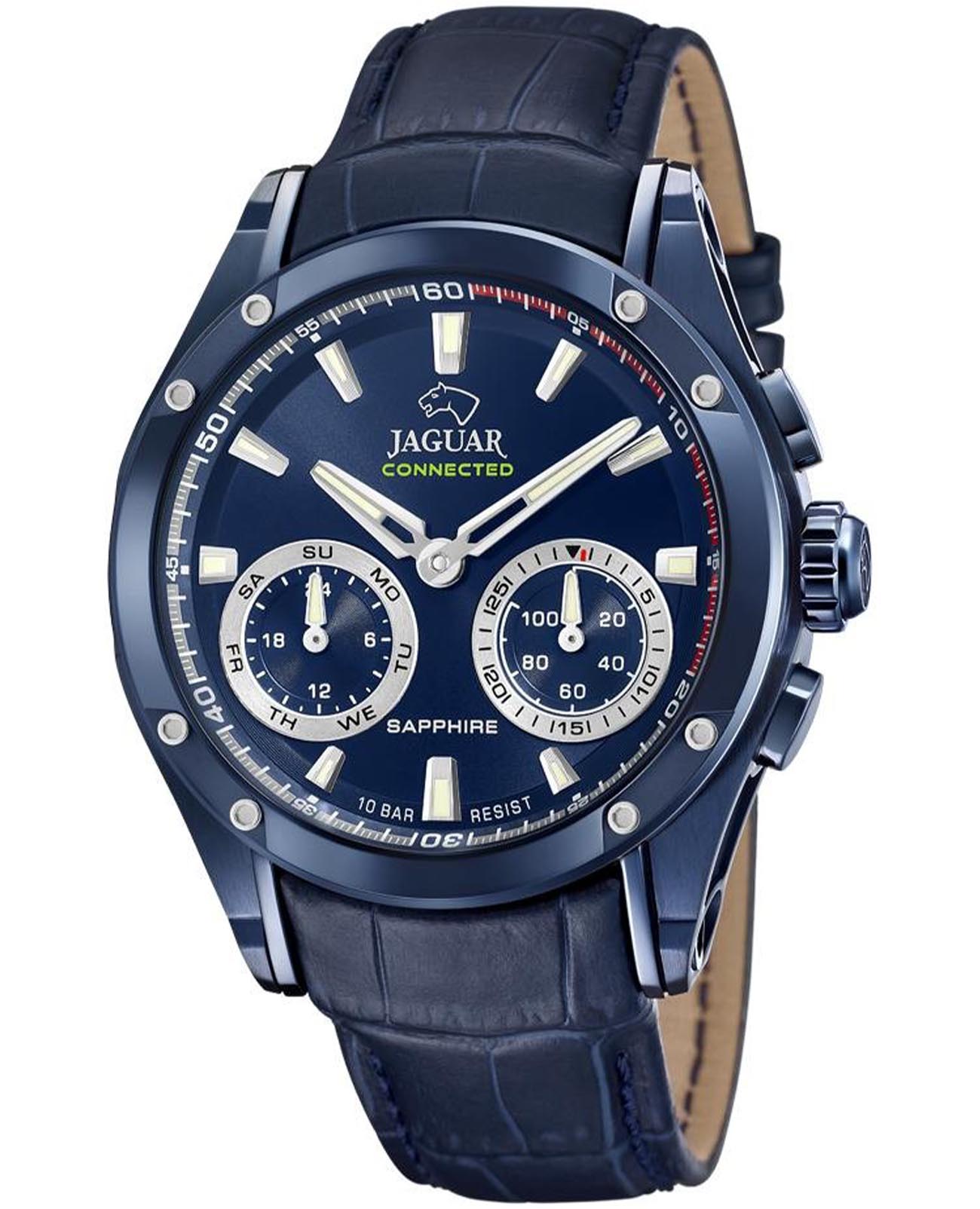 Мужские швейцарские часы Jaguar Connected J961/1. Сапфировое стеклоСапфировое стеклоПрочный и надёжный материал из кристалла сапфира синтетического происхождения, характеризующийся особой твёрдостью и устойчивостью к царапинам и повреждениям. устойчивое к мелким механическим повреждениям. Корпус часов изготовлен из нержавеющей стали с PVD-покрытиемPVDУльтратонкое покрытие наносится в технике вакуумного напыления, сочетает в себе нитрид титана особой прочности со слоем золота или оксида хрома. Несёт в себе декоративную или защитную функцию.. Стрелки и метки с люминесцентным покрытиемЛюминесцентное покрытиеПозволяет считывать показания времени в темноте. Производители наносят на стрелки, часовые индексы, безель или поверхность циферблата светонакопительный состав, дающий холодное свечение.. Календарь находится в положении 8 часов. Класс водозащиты: 100 метров, позволит плавать, нырять и заниматься другими водными видами спорта. Кожаный ремешок на стандартной застёжке. БезельБезельВнешний ободок, закрепляющий стекло. В спортивных часах так называется поворотное кольцо с делениями на циферблате, выполняет роль таймера – замеряет отрезки времени на шкале. Неподвижный безель – элемент декора. Однонаправленно вращающийся безель на дайверских часах позволяет фиксировать моменты погружения и выныривания на поверхность. с PVD-покрытиемPVDУльтратонкое покрытие наносится в технике вакуумного напыления, сочетает в себе нитрид титана особой прочности со слоем золота или оксида хрома. Несёт в себе декоративную или защитную функцию.. За точный ход работы часов, из коллекции Connected, отвечает кварцевый гибридный механизм швейцарского производства со Смарт-Модулем. Данный тип механизма обеспечивает возможность подключить часы к телефону через Bluetooth и управлять большим рядом дополнительных функций на выбор с помошью приложения Jaguar. Дополнительные функции: отображение даты и дня недели, секундомер, таймер, GMT, шагомер, поиск телефона, включение/выключение звука телефона при входящих вызовах, переключение музыки, вибро-уведомления.