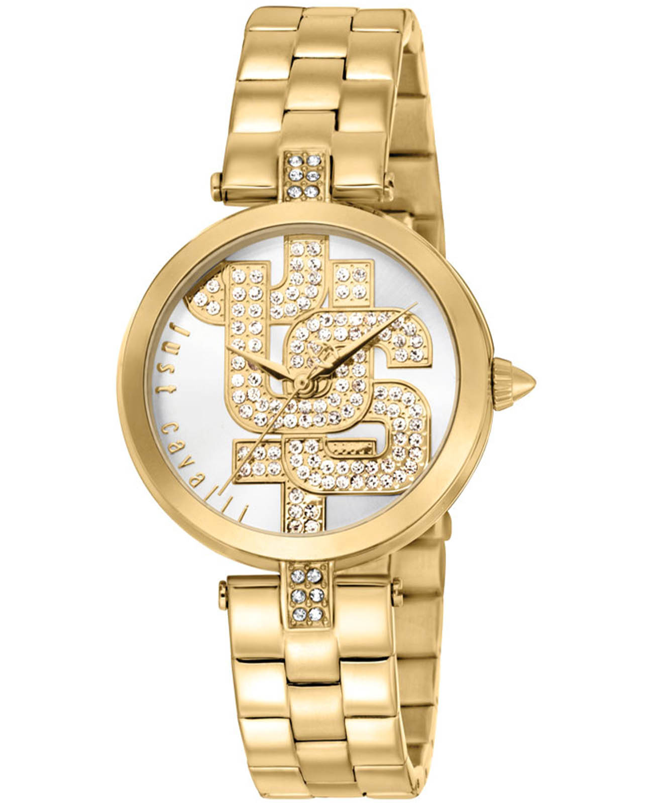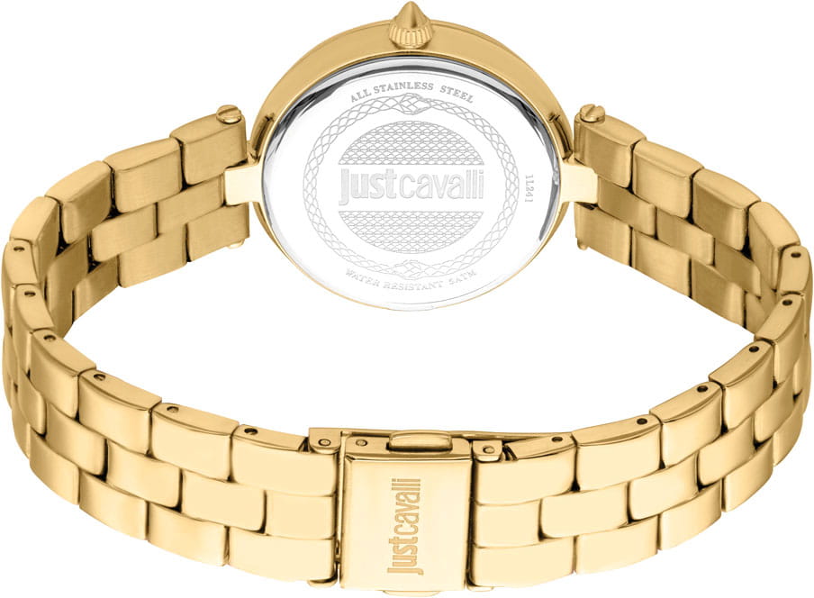 Элегантные женские часы Just Cavalli JC1L241M0055 с минеральным стекломМинеральное стеклоМинеральное стекло представляет собой искусственно выращенный минерал кварца. Такое стекло отличается особой устойчивостью к повреждениям и царапинам. Уступает по некоторым качествам сапфировому стеклу., кварцевый механизм с высокой точностью. БезельБезельВнешний ободок, закрепляющий стекло. В спортивных часах так называется поворотное кольцо с делениями на циферблате, выполняет роль таймера – замеряет отрезки времени на шкале. Неподвижный безель – элемент декора. Однонаправленно вращающийся безель на дайверских часах позволяет фиксировать моменты погружения и выныривания на поверхность. и циферблат украшен кристаллами. Корпус и браслет часов изготовлен из стали с PVD-покрытиемPVDУльтратонкое покрытие наносится в технике вакуумного напыления, сочетает в себе нитрид титана особой прочности со слоем золота или оксида хрома. Несёт в себе декоративную или защитную функцию.. Класс водозащиты: 50 метров, позволит защитить корпус от случайных брызг или капель дождя.