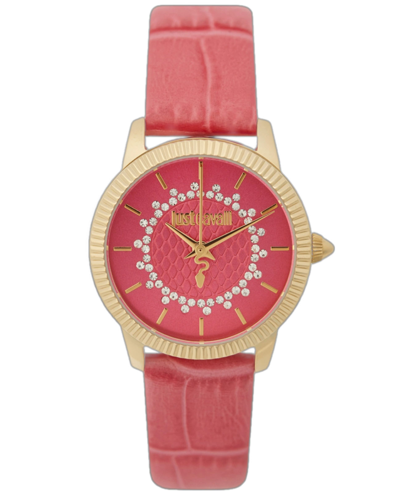 Элегантные женские часы Just Cavalli JC1L258L0215 с минеральным стекломМинеральное стеклоМинеральное стекло представляет собой искусственно выращенный минерал кварца. Такое стекло отличается особой устойчивостью к повреждениям и царапинам. Уступает по некоторым качествам сапфировому стеклу., кварцевый механизм с высокой точностью. Циферблат украшен кристаллами. Корпус часов изготовлен из стали с PVD-покрытиемPVDУльтратонкое покрытие наносится в технике вакуумного напыления, сочетает в себе нитрид титана особой прочности со слоем золота или оксида хрома. Несёт в себе декоративную или защитную функцию.. Класс водозащиты: 50 метров, позволит защитить корпус от случайных брызг или капель дождя. Кожаный ремешок на стандартной застёжке.