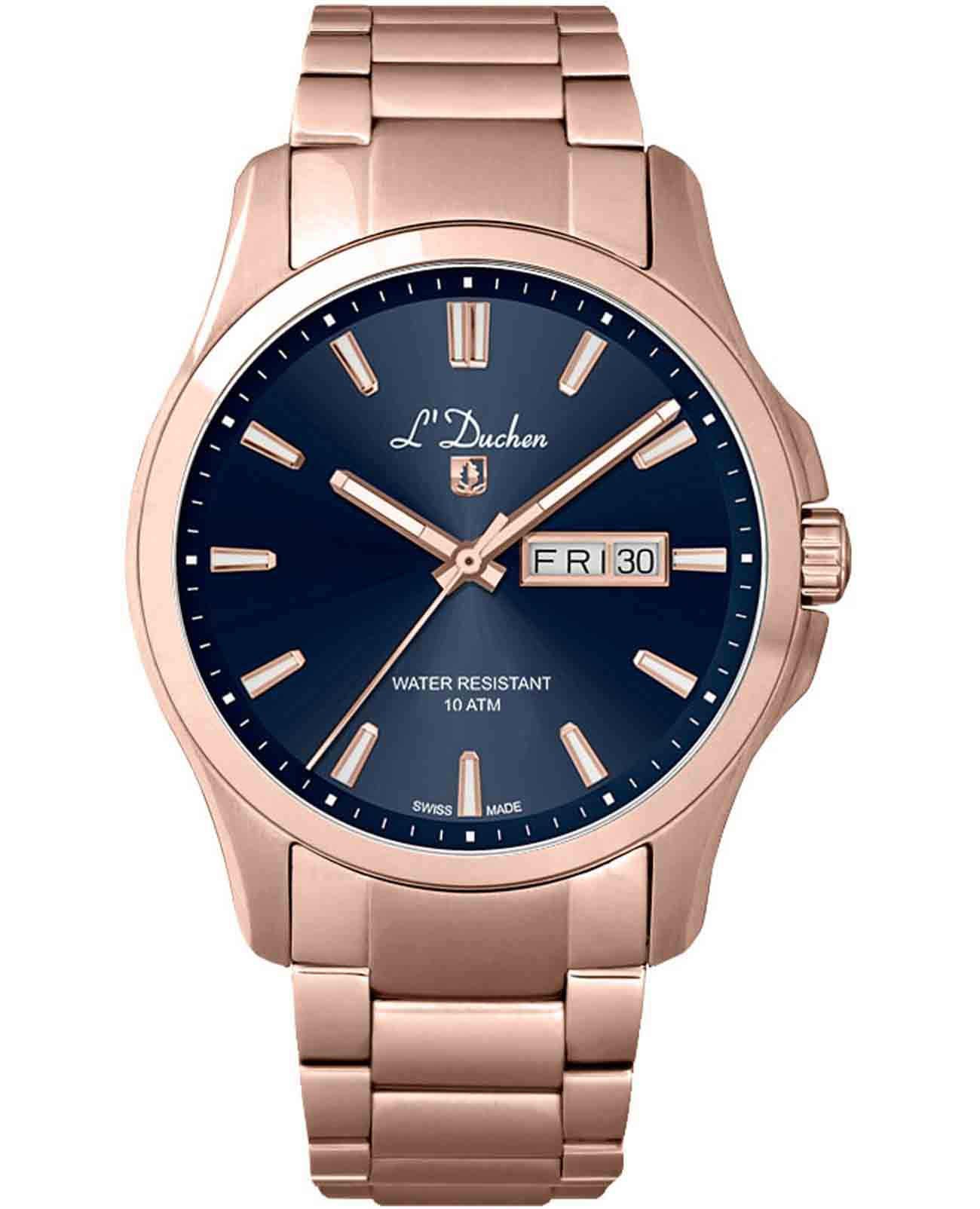 Мужские швейцарские часы L'Duchen Dynamique D 261.40.36, кварцевый механизм с высокой точностью. Сапфировое стеклоСапфировое стеклоПрочный и надёжный материал из кристалла сапфира синтетического происхождения, характеризующийся особой твёрдостью и устойчивостью к царапинам и повреждениям. устойчивое к появлению царапин, обладающее высокой прозрачностью. Корпус часов выполнен из нержавеющей стали с PVD-покрытиемPVDУльтратонкое покрытие наносится в технике вакуумного напыления, сочетает в себе нитрид титана особой прочности со слоем золота или оксида хрома. Несёт в себе декоративную или защитную функцию.. Стрелки с люминесцентным покрытиемЛюминесцентное покрытиеПозволяет считывать показания времени в темноте. Производители наносят на стрелки, часовые индексы, безель или поверхность циферблата светонакопительный состав, дающий холодное свечение.. Окошко даты находится в положении 3 часа. Класс водозащиты: 100 метров, позволит плавать, нырять и заниматься другими водными видами спорта. Стальной браслет с PVD-покрытиемPVDУльтратонкое покрытие наносится в технике вакуумного напыления, сочетает в себе нитрид титана особой прочности со слоем золота или оксида хрома. Несёт в себе декоративную или защитную функцию. на застёжке «бабочка» с кнопкамиЗастёжка "бабочка"Такой вид застёжки дополняется предохранителями, помогающими избежать случайного раскрытия браслета. Обладают изящным исполнением. .