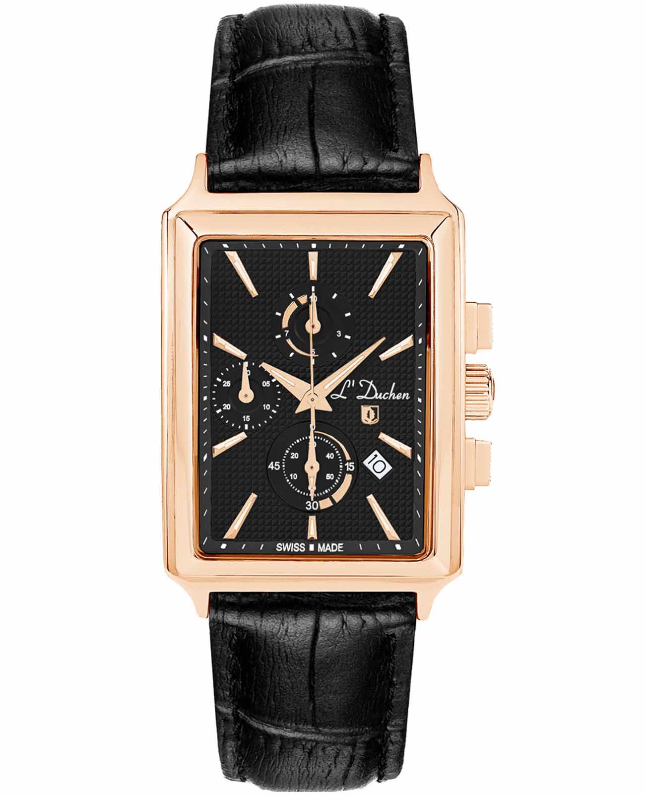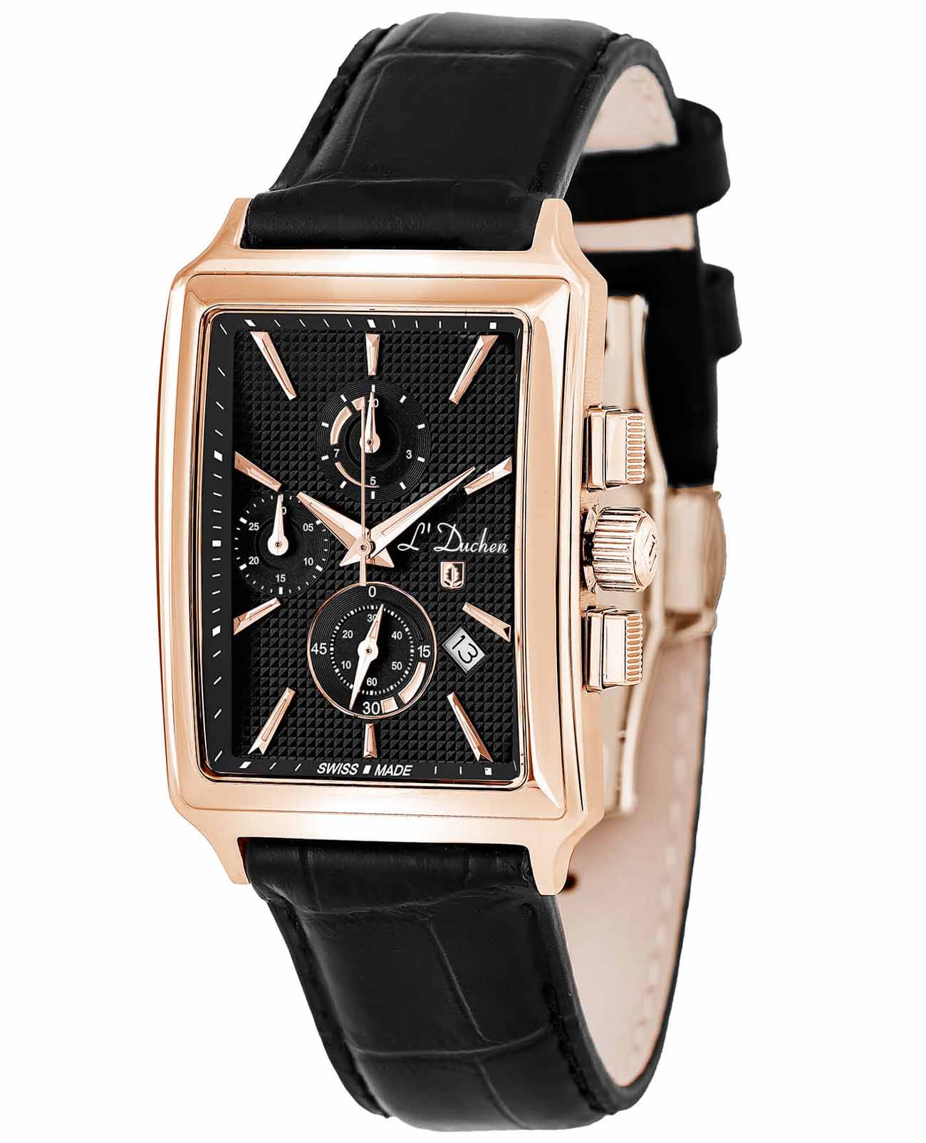 Мужские швейцарские часы- хронографХронографФункция позволяет измерять отрезки времени с особой точностью: часы, минуты, секунды. Верным признаком хронографа является наличие на циферблате 3 дополнительных окошек-счётчиков. L'Duchen Adventure Chrono D 612.41.31, кварцевый механизм с высокой точностью. Сапфировое стеклоСапфировое стеклоПрочный и надёжный материал из кристалла сапфира синтетического происхождения, характеризующийся особой твёрдостью и устойчивостью к царапинам и повреждениям. устойчивое к появлению царапин, обладающее высокой прозрачностью. Корпус часов выполнен из нержавеющей стали с PVD-покрытиемPVDУльтратонкое покрытие наносится в технике вакуумного напыления, сочетает в себе нитрид титана особой прочности со слоем золота или оксида хрома. Несёт в себе декоративную или защитную функцию.. Стрелки с люминесцентным покрытиемЛюминесцентное покрытиеПозволяет считывать показания времени в темноте. Производители наносят на стрелки, часовые индексы, безель или поверхность циферблата светонакопительный состав, дающий холодное свечение.. Окошко даты находится в положении между 4 и 5  часами. Класс водозащиты: 50 метров, позволит защитить корпус от случайных брызг или капель дождя. Кожаный ремешок на застёжке «бабочка» с кнопкамиЗастёжка "бабочка"Такой вид застёжки дополняется предохранителями, помогающими избежать случайного раскрытия браслета. Обладают изящным исполнением. .