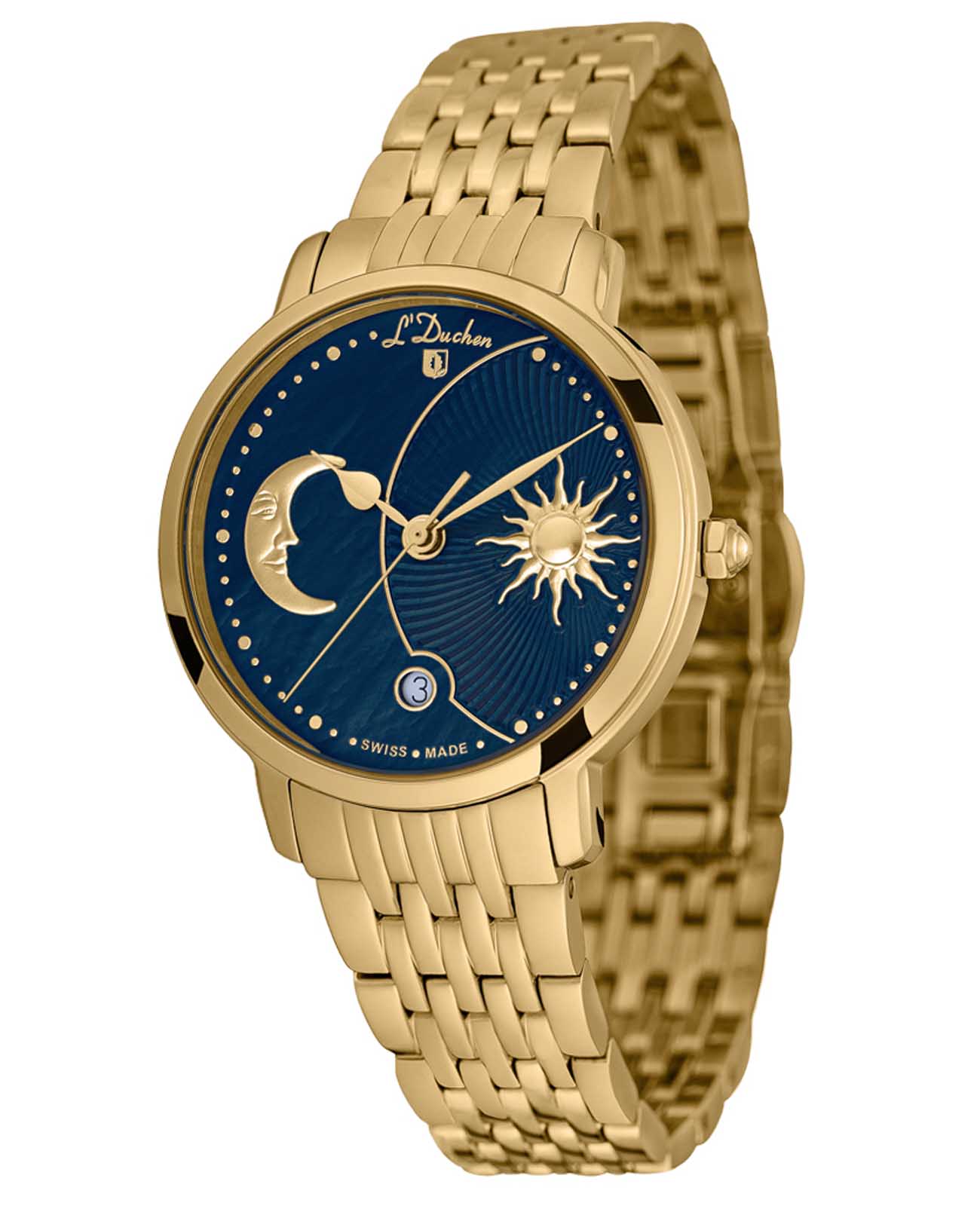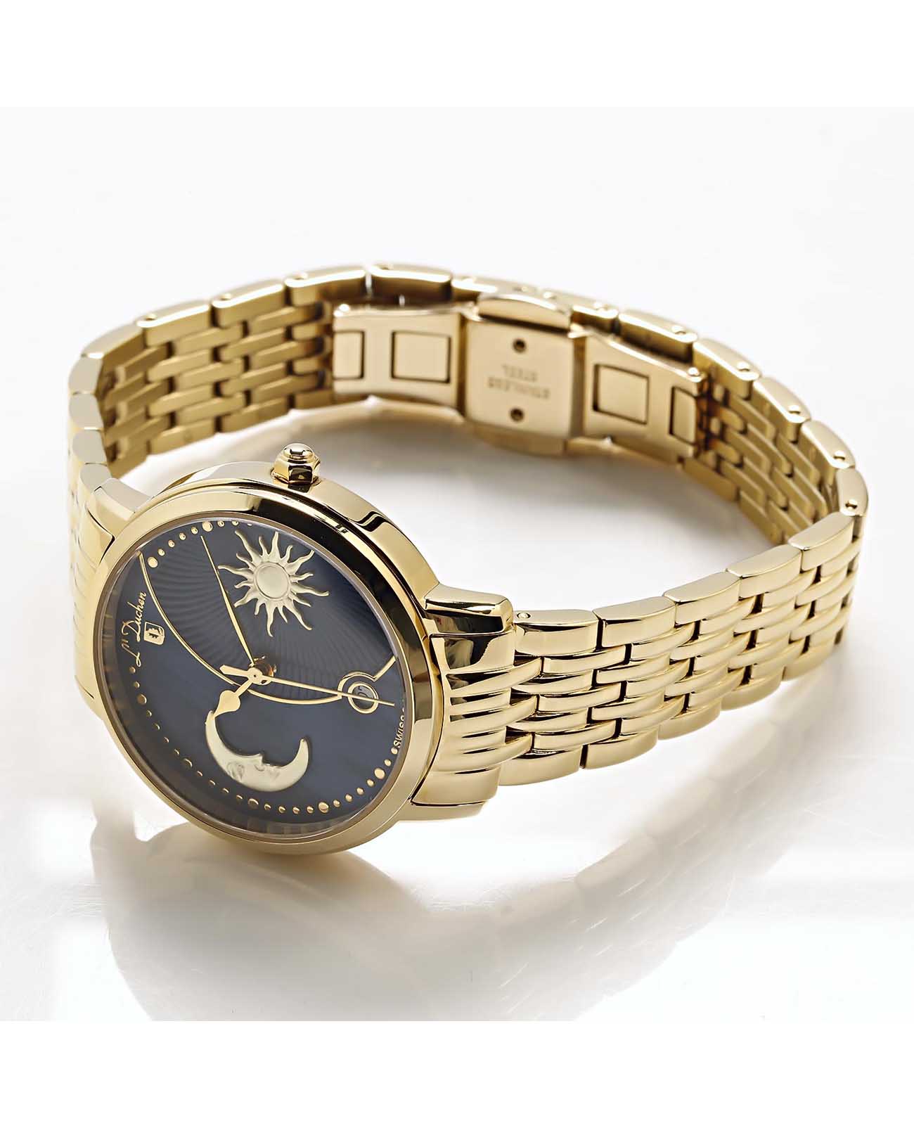 Женские швейцарские часы L'Duchen Day & Night D 781.20.37, кварцевый механизм с высокой точностью. Сапфировое стеклоСапфировое стеклоПрочный и надёжный материал из кристалла сапфира синтетического происхождения, характеризующийся особой твёрдостью и устойчивостью к царапинам и повреждениям. устойчивое к появлению царапин, обладающее высокой прозрачностью. Корпус часов выполнен из нержавеющей стали с PVD-покрытиемPVDУльтратонкое покрытие наносится в технике вакуумного напыления, сочетает в себе нитрид титана особой прочности со слоем золота или оксида хрома. Несёт в себе декоративную или защитную функцию.. Окошко даты находится в положении 6 часов. Класс водозащиты: 50 метров, позволит защитить корпус от случайных брызг или капель дождя. Стальной браслет с PVD-покрытиемPVDУльтратонкое покрытие наносится в технике вакуумного напыления, сочетает в себе нитрид титана особой прочности со слоем золота или оксида хрома. Несёт в себе декоративную или защитную функцию. на застёжке «бабочка» с кнопкамиЗастёжка "бабочка"Такой вид застёжки дополняется предохранителями, помогающими избежать случайного раскрытия браслета. Обладают изящным исполнением. .