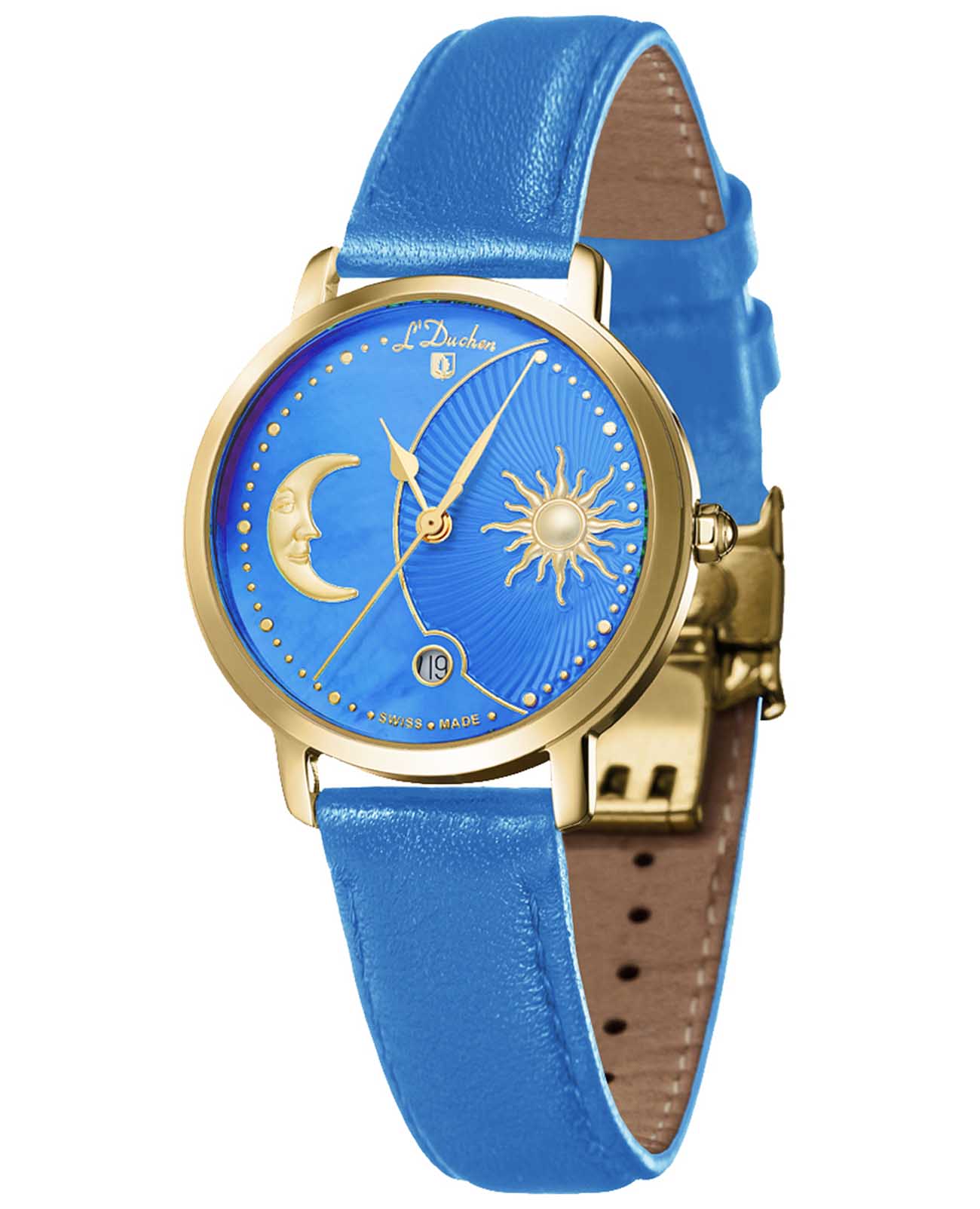 Женские швейцарские часы L'Duchen Day & Night D 781.28.32, кварцевый механизм с высокой точностью. Сапфировое стеклоСапфировое стеклоПрочный и надёжный материал из кристалла сапфира синтетического происхождения, характеризующийся особой твёрдостью и устойчивостью к царапинам и повреждениям. устойчивое к появлению царапин, обладающее высокой прозрачностью. Корпус часов выполнен из нержавеющей стали с PVD-покрытиемPVDУльтратонкое покрытие наносится в технике вакуумного напыления, сочетает в себе нитрид титана особой прочности со слоем золота или оксида хрома. Несёт в себе декоративную или защитную функцию.. Окошко даты находится в положении 6 часов. Класс водозащиты: 50 метров, позволит защитить корпус от случайных брызг или капель дождя. Кожаный ремешок на застёжке «бабочка» с кнопкамиЗастёжка "бабочка"Такой вид застёжки дополняется предохранителями, помогающими избежать случайного раскрытия браслета. Обладают изящным исполнением. .
