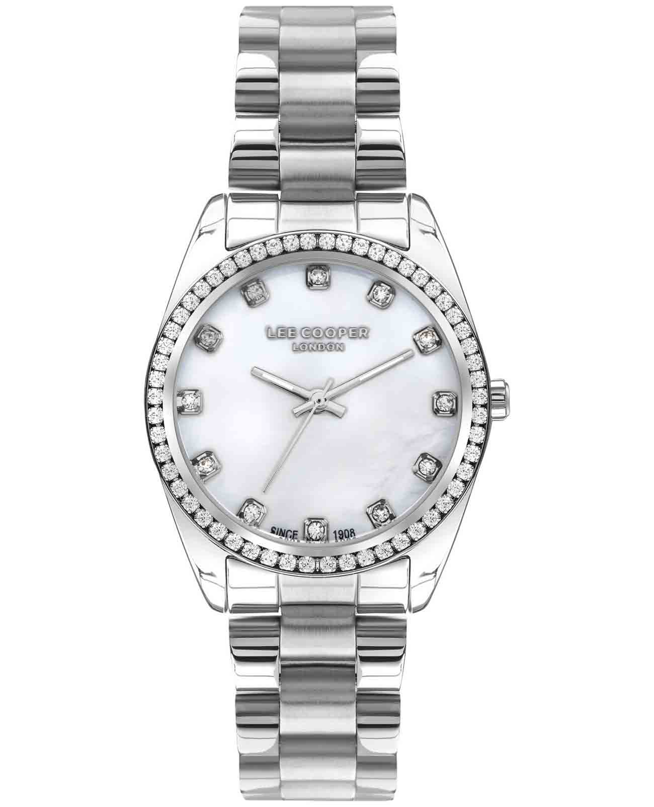 Женские наручные часы Lee CooperLC07478.320 — это элегантная модель с утончённым дизайном. Корпус диаметром 34 мм выполнен из суперметалла, что придаёт часам изысканный вид. Перламутровый циферблат украшен изящными стрелками и вставками из циркония в виде меток, обеспечивая удобное считывание времени. Циферблат защищён минеральным стекломМинеральное стеклоМинеральное стекло представляет собой искусственно выращенный минерал кварца. Такое стекло отличается особой устойчивостью к повреждениям и царапинам. Уступает по некоторым качествам сапфировому стеклу., устойчивым к царапинам. Часы работают на кварцевом механизме, обеспечивая точность хода. Браслет из нержавеющей стали с раскладной застёжкойРаскладная застёжкаТакой тип застёжки используется только на браслетах из металла. Она никогда не раскрывается полностью, происходит разделение на 2 и более частей. Раскладывающая застёжка снизит вероятность потери часов к минимуму. гарантирует комфортное ношение и надёжную фиксацию на запястье. Водозащита 30 метров защищает часы от случайных брызг и дождя, делая их подходящими для повседневного использования. БезельБезельВнешний ободок, закрепляющий стекло. В спортивных часах так называется поворотное кольцо с делениями на циферблате, выполняет роль таймера – замеряет отрезки времени на шкале. Неподвижный безель – элемент декора. Однонаправленно вращающийся безель на дайверских часах позволяет фиксировать моменты погружения и выныривания на поверхность. инкрустирован кристаллами. Стрелки покрыты люминесцентным покрытиемЛюминесцентное покрытиеПозволяет считывать показания времени в темноте. Производители наносят на стрелки, часовые индексы, безель или поверхность циферблата светонакопительный состав, дающий холодное свечение., обеспечивая удобное считывание показаний в условиях недостаточного освещения.