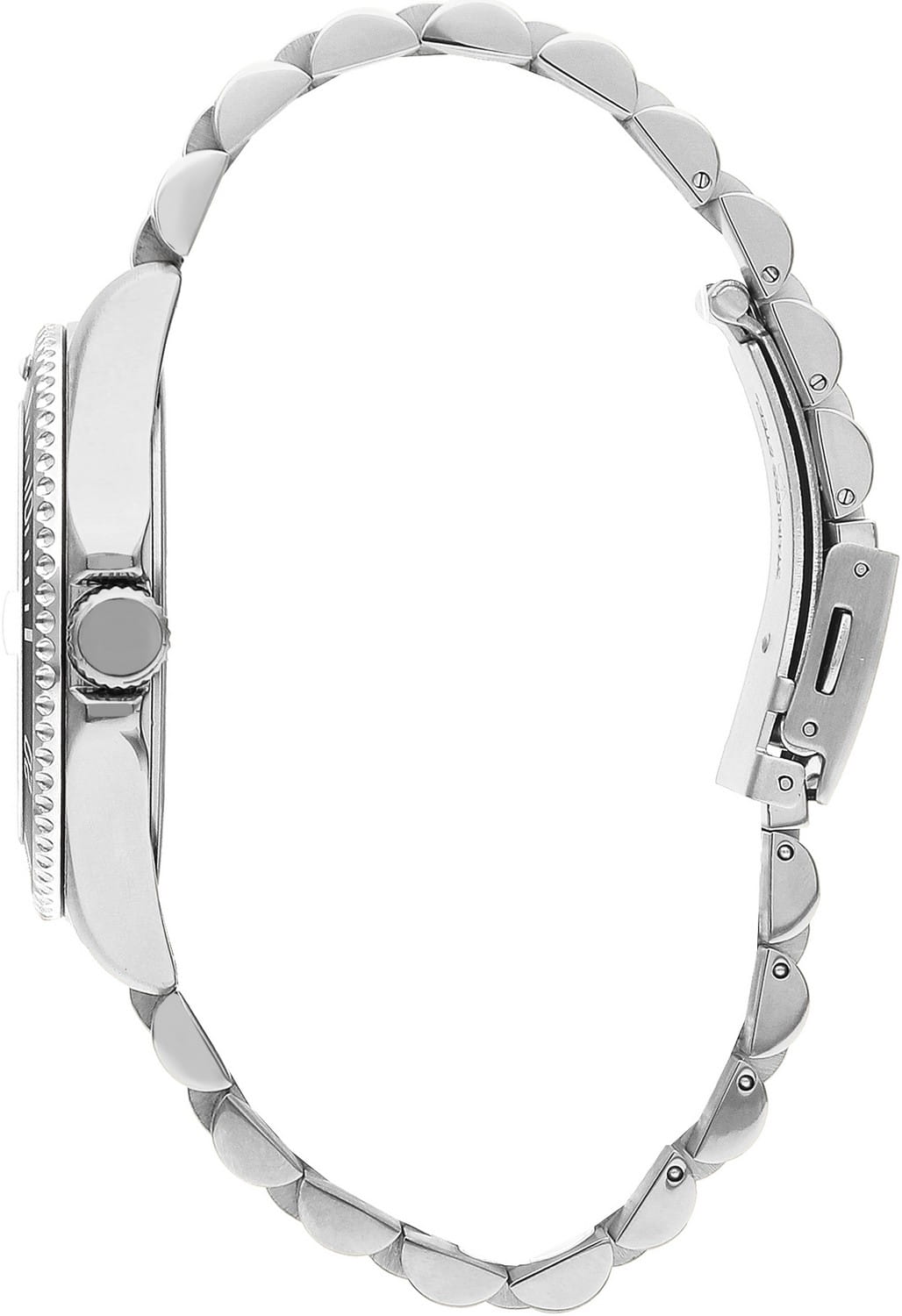 Женские часы Lee Cooper LC07593.390 — это стильное сочетание элегантности и современного дизайна. Круглый корпус диаметром 36 мм выполнен из суперметалла серебристого цвета. Циферблат защищен минеральным стекломМинеральное стеклоМинеральное стекло представляет собой искусственно выращенный минерал кварца. Такое стекло отличается особой устойчивостью к повреждениям и царапинам. Уступает по некоторым качествам сапфировому стеклу., обеспечивающий устойчивость к царапинам. Поворотный безельБезельВнешний ободок, закрепляющий стекло. В спортивных часах так называется поворотное кольцо с делениями на циферблате, выполняет роль таймера – замеряет отрезки времени на шкале. Неподвижный безель – элемент декора. Однонаправленно вращающийся безель на дайверских часах позволяет фиксировать моменты погружения и выныривания на поверхность. с IP-покрытиемIP-покрытиеМетод ионного напыления. Демонстрирует повышенную устойчивость к истиранию, окислению и химическим веществам. Под воздействием высокого давления и температуры около 1500°C молекулы металла надёжно соединяются с частицами корпуса часов. синего цвета. Центральные часовая, минутная и секундная стрелки. Часы оснащены надежным кварцевым механизмом, источник питания - батарейка. Металлический браслет на раскладной застёжкеРаскладная застёжкаТакой тип застёжки используется только на браслетах из металла. Она никогда не раскрывается полностью, происходит разделение на 2 и более частей. Раскладывающая застёжка снизит вероятность потери часов к минимуму. гарантирует комфортную посадку на запястье. Водозащита 30 метров защищает модель от случайных брызг и дождя. Стрелки с люминесцентным покрытиемЛюминесцентное покрытиеПозволяет считывать показания времени в темноте. Производители наносят на стрелки, часовые индексы, безель или поверхность циферблата светонакопительный состав, дающий холодное свечение. позволяющие легко определять время даже в темноте. Lee Cooper — отличный выбор для тех, кто ценит утонченность и качество.