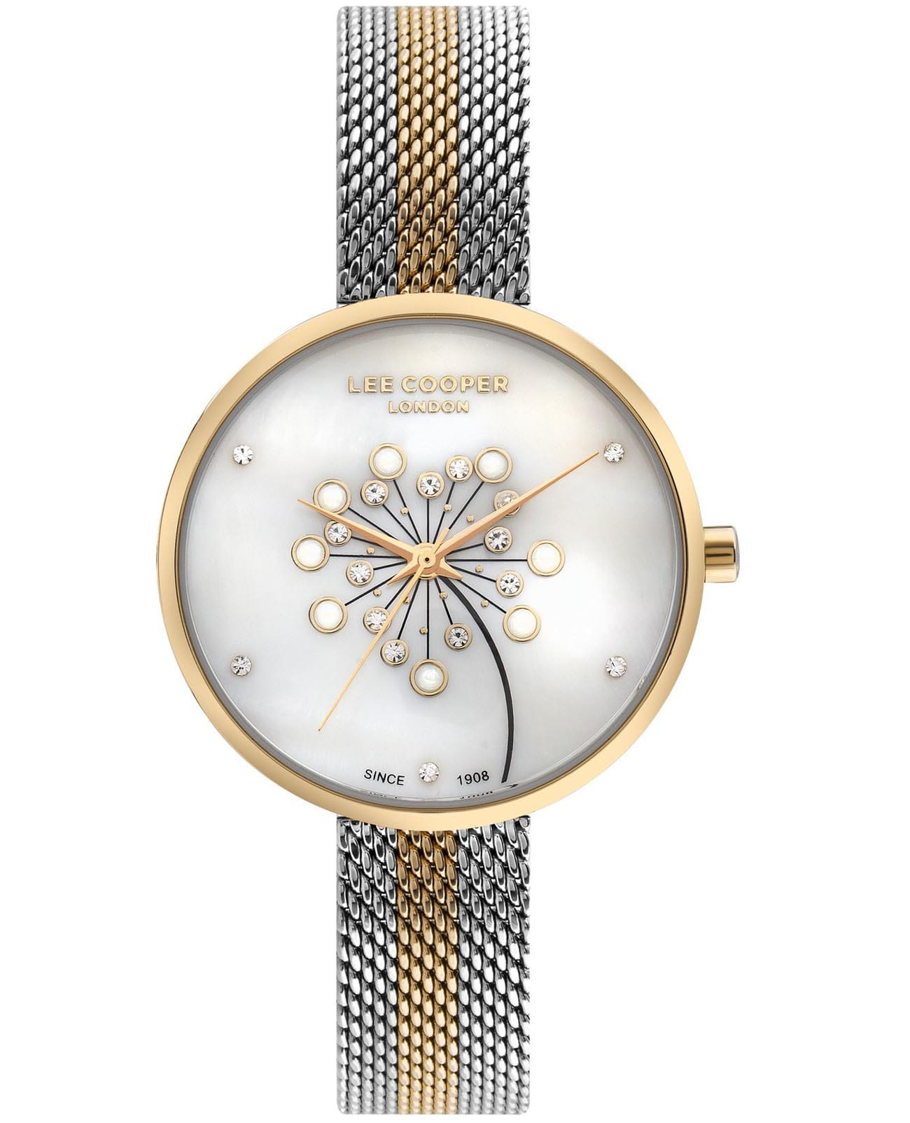 Женские часы Lee Cooper LC07601.220 — это стильное сочетание элегантности и современного дизайна. Круглый корпус диаметром 32 мм выполнен из суперметалла с IP-покрытиемIP-покрытиеМетод ионного напыления. Демонстрирует повышенную устойчивость к истиранию, окислению и химическим веществам. Под воздействием высокого давления и температуры около 1500°C молекулы металла надёжно соединяются с частицами корпуса часов. золотистого цвета. Циферблат украшен цирконами и защищен минеральным стекломМинеральное стеклоМинеральное стекло представляет собой искусственно выращенный минерал кварца. Такое стекло отличается особой устойчивостью к повреждениям и царапинам. Уступает по некоторым качествам сапфировому стеклу., обеспечивающий устойчивость к царапинам. Центральные часовая, минутная и секундная стрелки. Часы оснащены надежным кварцевым механизмом, источник питания - батарейка. Металлический браслет миланского плетения с частичным IP-покрытиемIP-покрытиеМетод ионного напыления. Демонстрирует повышенную устойчивость к истиранию, окислению и химическим веществам. Под воздействием высокого давления и температуры около 1500°C молекулы металла надёжно соединяются с частицами корпуса часов. на раскладном замкеРаскладная застёжкаТакой тип застёжки используется только на браслетах из металла. Она никогда не раскрывается полностью, происходит разделение на 2 и более частей. Раскладывающая застёжка снизит вероятность потери часов к минимуму. гарантирует комфортную посадку на запястье. Водозащита 30 метров защищает модель от случайных брызг и дождя. Lee Cooper — отличный выбор для тех, кто ценит утонченность и качество.