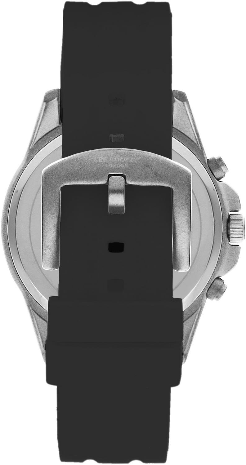Lee Cooper LC07635.351  — элегантная модель с функциональными возможностями для повседневного использования. Корпус из суперметалла диаметром 46 мм придаёт часам классический и современный вид. Циферблат защищён минеральным стекломМинеральное стеклоМинеральное стекло представляет собой искусственно выращенный минерал кварца. Такое стекло отличается особой устойчивостью к повреждениям и царапинам. Уступает по некоторым качествам сапфировому стеклу., устойчивым к царапинам, хорошо может выдержать небольшие удары и падения. Стильный циферблат оформлен изысканными индексами и дополнен окошками даты, дня недели и 24-часового индикатора, а также аккуратными метками и стрелками с люминесцентным покрытиемЛюминесцентное покрытиеПозволяет считывать показания времени в темноте. Производители наносят на стрелки, часовые индексы, безель или поверхность циферблата светонакопительный состав, дающий холодное свечение., что гарантирует читаемость даже в условиях недостаточного освещения. Функция второго часового поясаВторой часовой поясФункция, позволяющая отображать время двух часовых поясов одновременно. делает часы удобными для путешественников. Часы работают на кварцевом механизме, обеспечивающем точность хода. Каучуковый ремешок на стандартной застёжке гарантирует удобную посадку и надёжную фиксацию на запястье. Водозащита 50 метров защищает часы от брызг и дождя, делая их подходящими для повседневного использования.