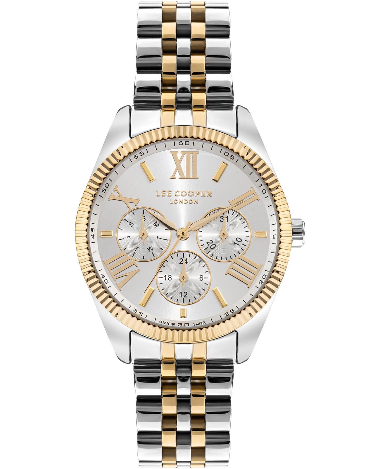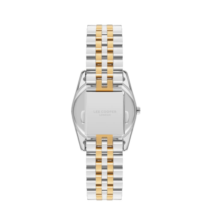 Женские часы Lee Cooper LC07811.230 — это стильное сочетание элегантности и современного дизайна. Корпус диаметром 37 мм выполнен из суперметалла серебристого цвета, придающий модели особый блеск. Неподвижный безельБезельВнешний ободок, закрепляющий стекло. В спортивных часах так называется поворотное кольцо с делениями на циферблате, выполняет роль таймера – замеряет отрезки времени на шкале. Неподвижный безель – элемент декора. Однонаправленно вращающийся безель на дайверских часах позволяет фиксировать моменты погружения и выныривания на поверхность. с IP-покрытиемIP-покрытиеМетод ионного напыления. Демонстрирует повышенную устойчивость к истиранию, окислению и химическим веществам. Под воздействием высокого давления и температуры около 1500°C молекулы металла надёжно соединяются с частицами корпуса часов. цвета золота. Изысканный циферблат защищен минеральным стекломМинеральное стеклоМинеральное стекло представляет собой искусственно выращенный минерал кварца. Такое стекло отличается особой устойчивостью к повреждениям и царапинам. Уступает по некоторым качествам сапфировому стеклу., обеспечивающим устойчивость к царапинам. Метки в виде римских цифр. Вынесенный циферблат с 24-х часовым указателем времени, индикацией даты и дня недели. Часы оснащены надежным кварцевым механизмом, а стальной браслет с частичным IP-покрытиемIP-покрытиеМетод ионного напыления. Демонстрирует повышенную устойчивость к истиранию, окислению и химическим веществам. Под воздействием высокого давления и температуры около 1500°C молекулы металла надёжно соединяются с частицами корпуса часов. на раскладной застёжкеРаскладная застёжкаТакой тип застёжки используется только на браслетах из металла. Она никогда не раскрывается полностью, происходит разделение на 2 и более частей. Раскладывающая застёжка снизит вероятность потери часов к минимуму. гарантирует комфортную посадку на запястье. Водозащита 50 метров защищает модель от случайных брызг и дождя. Lee Cooper  — отличный выбор для тех, кто ценит утонченность и качество.