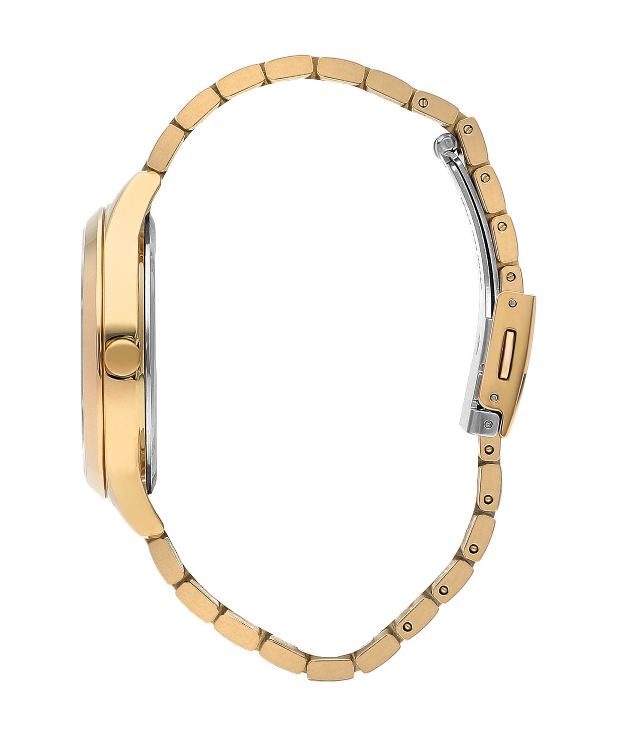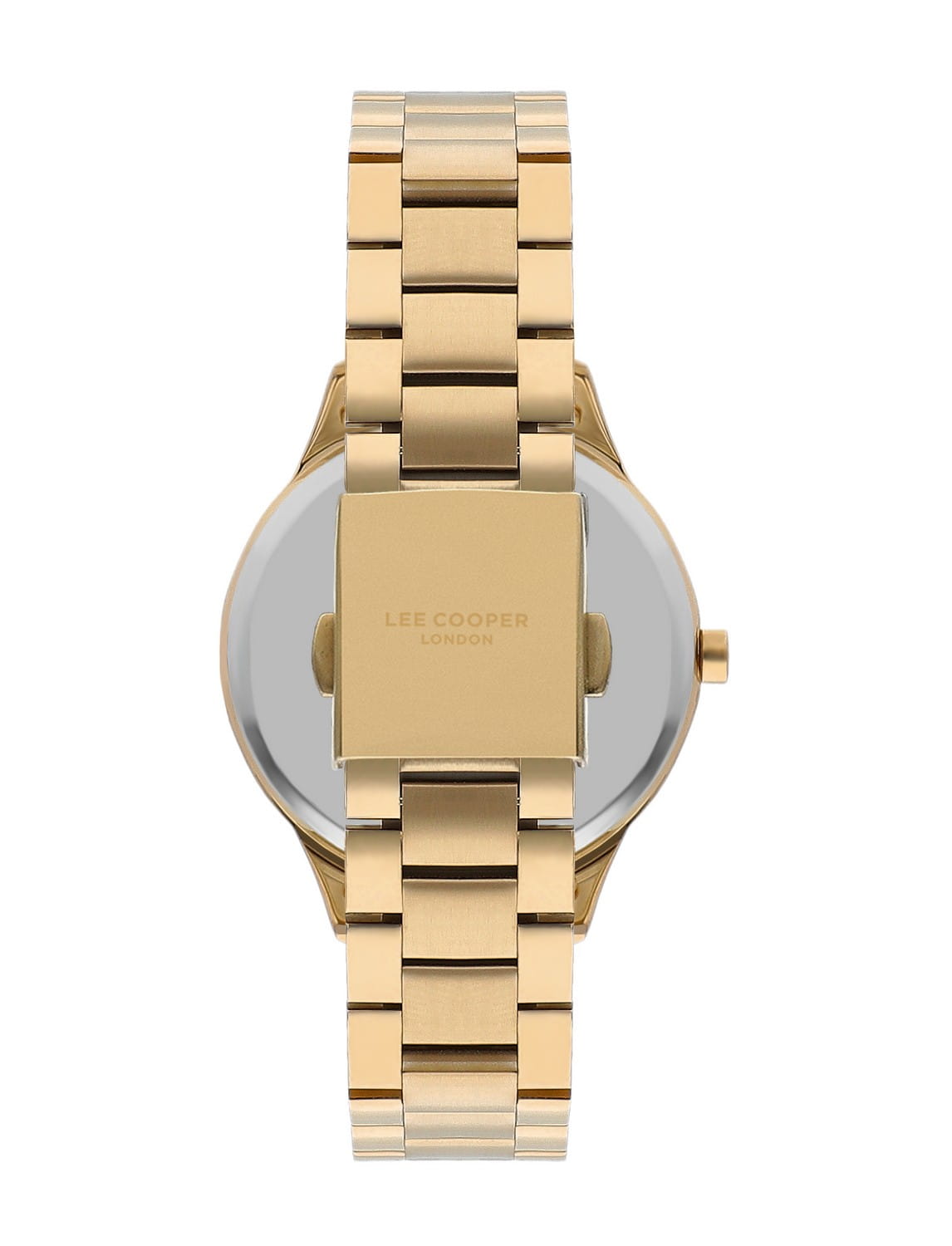Женские часы Lee Cooper LC07865.130 — это стильное сочетание элегантности и современного дизайна. Круглый корпус диаметром 38 мм выполнен из суперметалла с IP-покрытиемIP-покрытиеМетод ионного напыления. Демонстрирует повышенную устойчивость к истиранию, окислению и химическим веществам. Под воздействием высокого давления и температуры около 1500°C молекулы металла надёжно соединяются с частицами корпуса часов. золотого цвета, придающий модели особый блеск. Серебристый циферблат защищен минеральным стекломМинеральное стеклоМинеральное стекло представляет собой искусственно выращенный минерал кварца. Такое стекло отличается особой устойчивостью к повреждениям и царапинам. Уступает по некоторым качествам сапфировому стеклу., обеспечивающим устойчивость к царапинам. Часы оснащены надежным кварцевым механизмом, а стальной браслет с IP-покрытиемIP-покрытиеМетод ионного напыления. Демонстрирует повышенную устойчивость к истиранию, окислению и химическим веществам. Под воздействием высокого давления и температуры около 1500°C молекулы металла надёжно соединяются с частицами корпуса часов. на раскладной застёжкеРаскладная застёжкаТакой тип застёжки используется только на браслетах из металла. Она никогда не раскрывается полностью, происходит разделение на 2 и более частей. Раскладывающая застёжка снизит вероятность потери часов к минимуму. гарантирует комфортную посадку на запястье. Мультифункциональная модель с индикацией даты, дня недели, с дополнительным 24-х часовым индикатором. Водозащита 30 метров защищает модель от случайных брызг и дождя. Lee Cooper  — отличный выбор для тех, кто ценит утонченность и качество.