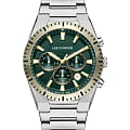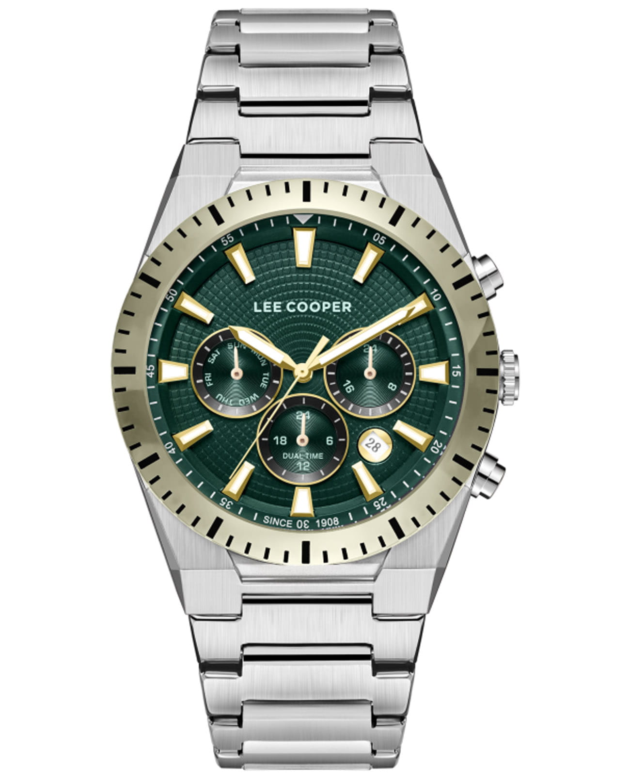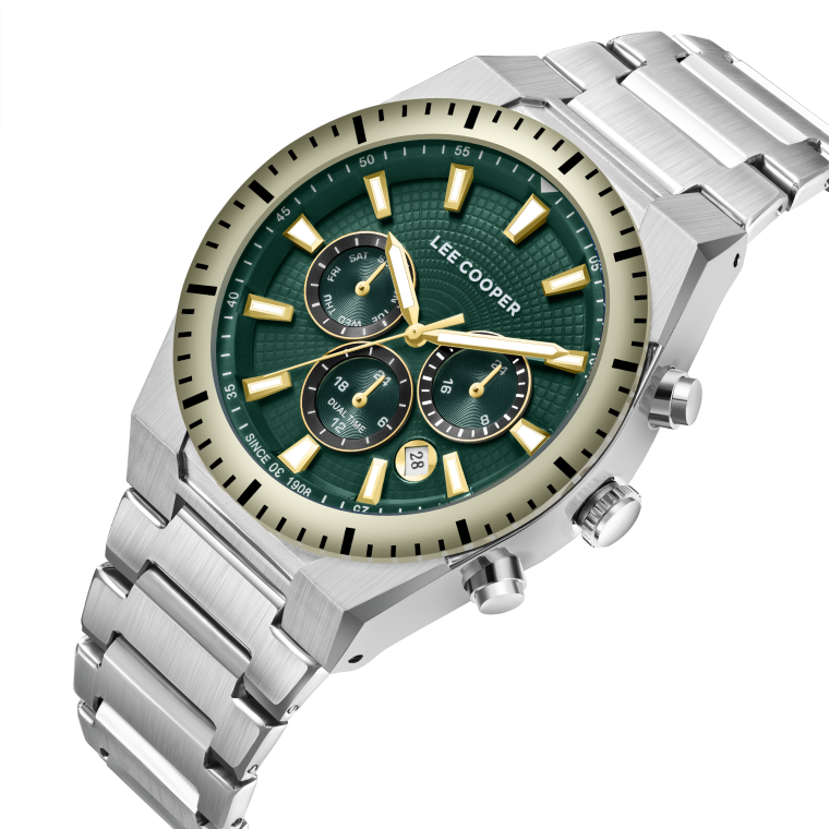 Мужские наручные часы Lee Cooper LC08100.270 — элегантная модель с функциональными возможностями для повседневного использования. Круглый корпус из нержавеющей стали придаёт часам классический и современный вид. Зеленый циферблат оснащён дополнительными индикаторами и функцией хронографаХронографФункция позволяет измерять отрезки времени с особой точностью: часы, минуты, секунды. Верным признаком хронографа является наличие на циферблате 3 дополнительных окошек-счётчиков., что позволяет измерять временные интервалы с высокой точностью. Стрелки и метки покрыты люминесцентным покрытиемЛюминесцентное покрытиеПозволяет считывать показания времени в темноте. Производители наносят на стрелки, часовые индексы, безель или поверхность циферблата светонакопительный состав, дающий холодное свечение., обеспечивая удобное считывание показаний в условиях недостаточного освещения. Циферблат защищён минеральным стекломМинеральное стеклоМинеральное стекло представляет собой искусственно выращенный минерал кварца. Такое стекло отличается особой устойчивостью к повреждениям и царапинам. Уступает по некоторым качествам сапфировому стеклу., устойчивым к царапинам. Часы работают на кварцевом механизме, обеспечивающем точность хода. Браслет из нержавеющей стали с раскладной застёжкойРаскладная застёжкаТакой тип застёжки используется только на браслетах из металла. Она никогда не раскрывается полностью, происходит разделение на 2 и более частей. Раскладывающая застёжка снизит вероятность потери часов к минимуму. гарантирует удобную посадку и надёжную фиксацию на запястье. Водозащита 50 метров защищает часы от брызг и дождя, делая их подходящими для повседневного использования.
