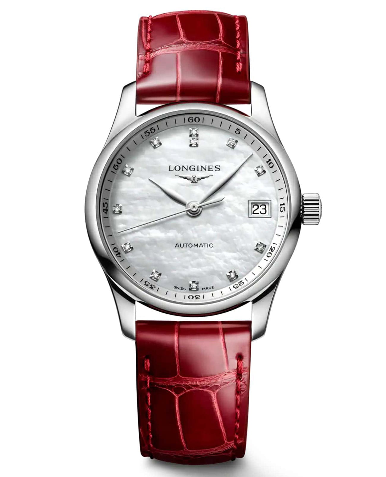Швейцарские механические часы Longines Master Collection L2.357.4.87.2. Сапфировое стеклоСапфировое стеклоПрочный и надёжный материал из кристалла сапфира синтетического происхождения, характеризующийся особой твёрдостью и устойчивостью к царапинам и повреждениям. устойчивое к появлению царапин, обладающее высокой прозрачностью. Корпус часов изготовлен из нержавеющей стали. Циферблат с 12 бриллиантами группы Top Wesselton VS-SI общим весом 0.055 карата. Окошко даты в положении 3 часа. Автоматический механизм с частотой баланса 25 200 полуколебаний в час и запасом хода, которого хватает примерно на 72 часа работы. Класс водозащиты: 30 метров, позволит защитить корпус от случайных брызг или капель дождя. Ремешок из кожи аллигатора на застёжке «бабочка» с кнопкамиЗастёжка "бабочка"Такой вид застёжки дополняется предохранителями, помогающими избежать случайного раскрытия браслета. Обладают изящным исполнением. .