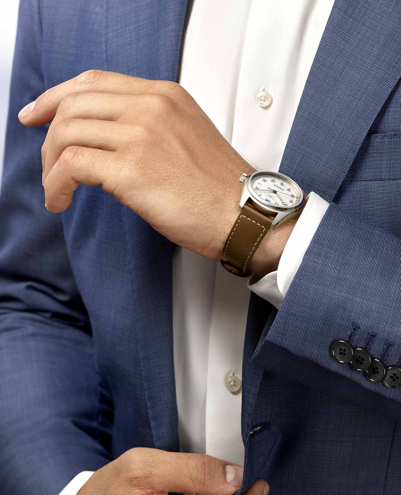 Дополнительные особенности включают сапфировое стеклоСапфировое стеклоПрочный и надёжный материал из кристалла сапфира синтетического происхождения, характеризующийся особой твёрдостью и устойчивостью к царапинам и повреждениям. с двухсторонним антибликовым покрытиемАнтибликовое покрытиеСлой оксида металла в 0,13-0,3 микрон, благодаря которому стекло часов не бликует и не отражает свет. Антибликовое покрытие уменьшает отражение света в 10 раз, обеспечивая отличную читаемость показателей циферблата., что обеспечивает отличную видимость циферблата в любых условиях. Стрелки и метки с люминесцентнымЛюминесцентное покрытиеПозволяет считывать показания времени в темноте. Производители наносят на стрелки, часовые индексы, безель или поверхность циферблата светонакопительный состав, дающий холодное свечение. покрытием облегчают чтение времени в темноте. Окошко даты удобно расположено на отметке 3 часа. Часы обладают классом водозащиты 100 метров, что позволяет использовать их для плавания и занятий водными видами спорта. Кожаный ремешок на стандартной застежке придает часам классический и элегантный вид.