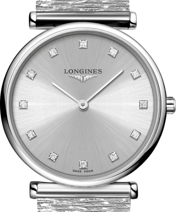 Женские швейцарские часы Longines La Grande Classique L4.512.4.74.6, кварцевый механизм с высокой точностью. Сапфировое стеклоСапфировое стеклоПрочный и надёжный материал из кристалла сапфира синтетического происхождения, характеризующийся особой твёрдостью и устойчивостью к царапинам и повреждениям. устойчивое к появлению царапин, обладающее высокой прозрачностью. Корпус часов изготовлен из стали. Циферблат дополнен 12 бриллиантами. Класс водозащиты: 30 метров, позволит защитить корпус от случайных брызг или капель дождя. Браслет из стали на раскладной застёжкеРаскладная застёжкаТакой тип застёжки используется только на браслетах из металла. Она никогда не раскрывается полностью, происходит разделение на 2 и более частей. Раскладывающая застёжка снизит вероятность потери часов к минимуму..