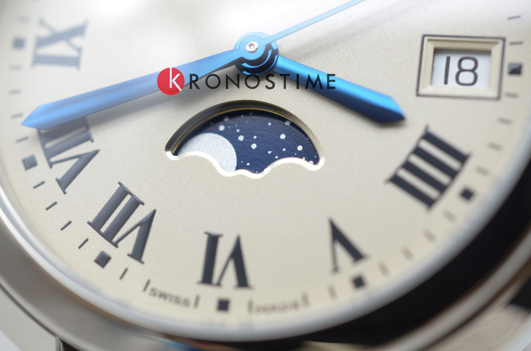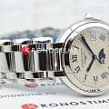 Окошко даты расположено в положении 3 часа, что позволяет быстро узнать текущую дату, не отрываясь от своих дел. Особенность этой модели – наличие индикатора фаз Луны в положении «6 часов», который добавляет часам загадочности и романтичности.