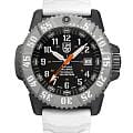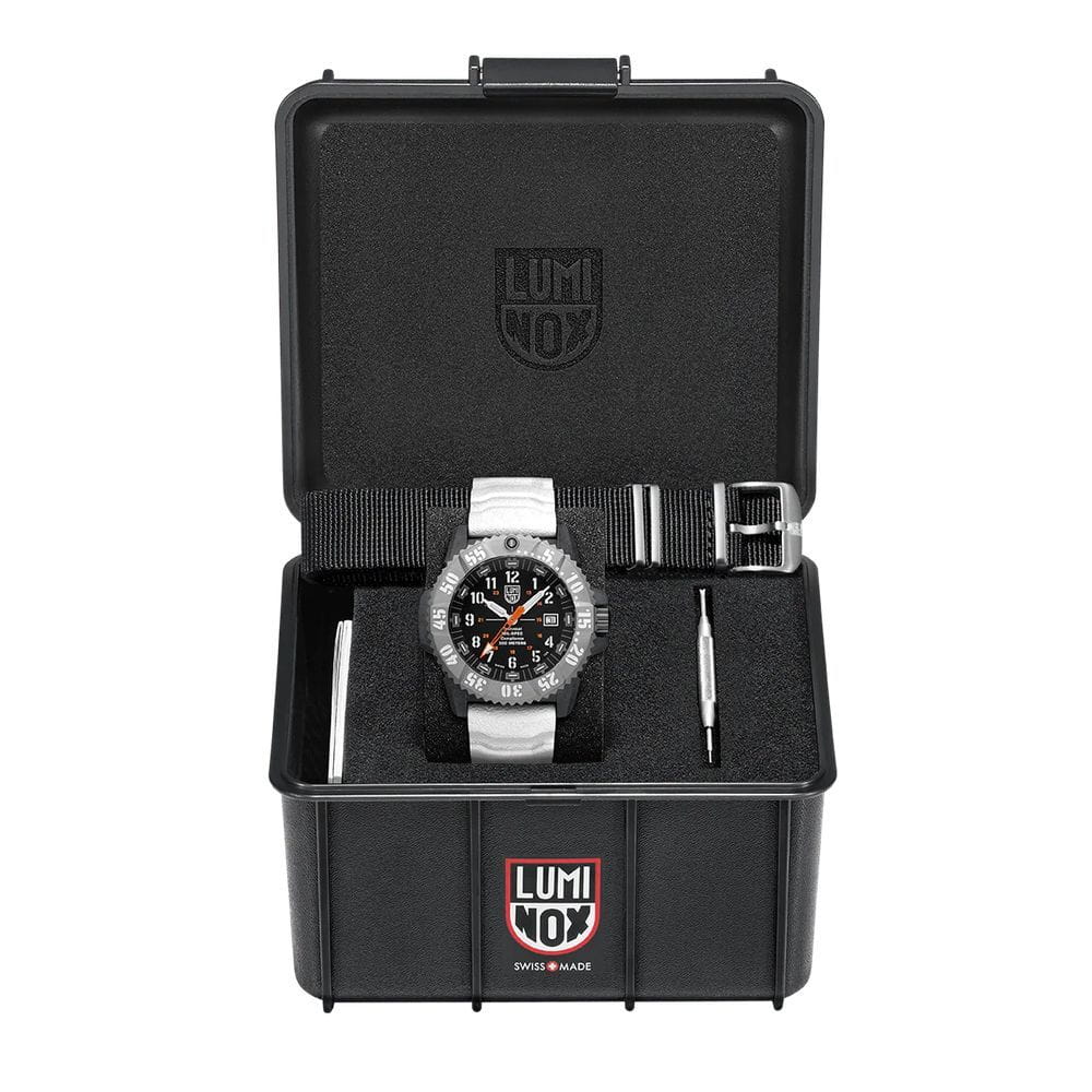 Luminox XL.3359.SET — мужская модель из коллекции Navy SEAL с мощным и функциональным дизайном, ориентированным на экстремальные условия. Корпус диаметром 46 мм выполнен из лёгкого и прочного углеродного композита Carbon Core GuardCarbon Core Guard Новейшая структура корпуса, разработанная Casio. Полиуретановая пластина дополнительно усилена карбоновыми вставками, что придаёт специальную защиту от механических повреждений. Карбон отличается лёгкостью и прочностью., а массивный односторонний вращающийся безельБезельВнешний ободок, закрепляющий стекло. В спортивных часах так называется поворотное кольцо с делениями на циферблате, выполняет роль таймера – замеряет отрезки времени на шкале. Неподвижный безель – элемент декора. Однонаправленно вращающийся безель на дайверских часах позволяет фиксировать моменты погружения и выныривания на поверхность. изготовлен из нержавеющей стали и дополнен крупной минутной разметкой для удобства под водой. Защитную функцию выполняет сапфировое стеклоСапфировое стеклоПрочный и надёжный материал из кристалла сапфира синтетического происхождения, характеризующийся особой твёрдостью и устойчивостью к царапинам и повреждениям. с антибликовым покрытиемАнтибликовое покрытиеСлой оксида металла в 0,13-0,3 микрон, благодаря которому стекло часов не бликует и не отражает свет. Антибликовое покрытие уменьшает отражение света в 10 раз, обеспечивая отличную читаемость показателей циферблата., обеспечивающим читаемость в любых условиях. В основе лежит швейцарский кварцевый механизм с индикацией часов, минут, секунд, даты и центральной секундной стрелкой. Водозащита 300 м (30 бар) соответствует профессиональным стандартам дайвинга. Метки и стрелки оснащены системой постоянной подсветки Luminox Light Technology, гарантирующей видимость до 25 лет без подзарядки. Модель укомплектована каучуковым ремешком с классической застёжкой, который обеспечивает комфорт и долговечность в носке. Так же в комплекте идет тканевый ремешок.