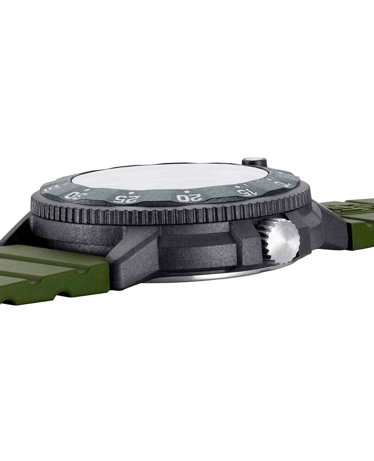 Мужские наручные часы Luminox XS.3013.EVO.S из коллекции Original Navy SEAL сочетают в себе спортивный дизайн и надежность швейцарского качества. Модель обладает круглым корпусом диаметром 43 мм, изготовленным из карбонаКарбонОт «carbon», «carbone» - углерод, углепластик - полимерный композиционный материал из переплетённых под определенным углом между собой нитей углеродного волокна, применяется для изготовления лёгких, но прочных деталей. В часах часто используют для украшения циферблатов и ремешков. Так же карбон используется в изготовлении корпусов. Такие корпуса обладают антикоррозионным свойством, не поддаются электромагнитному излучению, обладают повышенной прочностью и противоударностью. (CARBONOX™), что обеспечивает высокую устойчивость к внешним воздействиям при сохранении легкости . Циферблат зеленого цвета украшен контрастными метками и стрелками с , гарантирующим постоянную видимость времени даже в условиях низкой освещенности благодаря системе LLTLLTLLT — это автономный механизм подсветки, основанный на использовании микроскопических газонаполненных элементов. Специальные герметичные капсулы из боросиликатного стекла, интегрированные в циферблат, генерируют свечение без необходимости подключения к внешним источникам энергии. Для их работы не требуется ни дополнительный свет, ни механическое воздействие (например, нажатие кнопки). Свечение возникает благодаря химическому процессу: реакция между тритием, заключенным в капсулах, и люминофорным покрытием создает стабильное автономное освещение. Технология обеспечивает энергетическую независимость и долговечность подсветки. (микрогазовые огни) . Часы оснащены кварцевым механизмом швейцарского производства, обеспечивающим точность хода ±15 секунд в месяц . Защиту циферблата обеспечивает прочное сапфировое стеклоСапфировое стеклоПрочный и надёжный материал из кристалла сапфира синтетического происхождения, характеризующийся особой твёрдостью и устойчивостью к царапинам и повреждениям. с антибликовым покрытиемАнтибликовое покрытиеСлой оксида металла в 0,13-0,3 микрон, благодаря которому стекло часов не бликует и не отражает свет. Антибликовое покрытие уменьшает отражение света в 10 раз, обеспечивая отличную читаемость показателей циферблата., устойчивое к царапинам и механическим повреждениям . Водонепроницаемость модели достигает 20 атмосфер (200 метров), что делает их подходящими для плавания и активного отдыха на воде, включая дайвинг . Модель также оснащена безелемБезельВнешний ободок, закрепляющий стекло. В спортивных часах так называется поворотное кольцо с делениями на циферблате, выполняет роль таймера – замеряет отрезки времени на шкале. Неподвижный безель – элемент декора. Однонаправленно вращающийся безель на дайверских часах позволяет фиксировать моменты погружения и выныривания на поверхность. с односторонним вращением, что добавляет функциональности при использовании в водных условиях . Ремешок выполнен из зеленого каучука, что обеспечивает комфортное ношение в течение дня и удобство в уходе . Дополнительно часы имеют окно даты в положении «3 часа», что делает их практичными для повседневного использования . Сочетание современных технологий, надежности и стильного дизайна делает Luminox XS.3013.EVO.S идеальным выбором для ценителей качественных аксессу